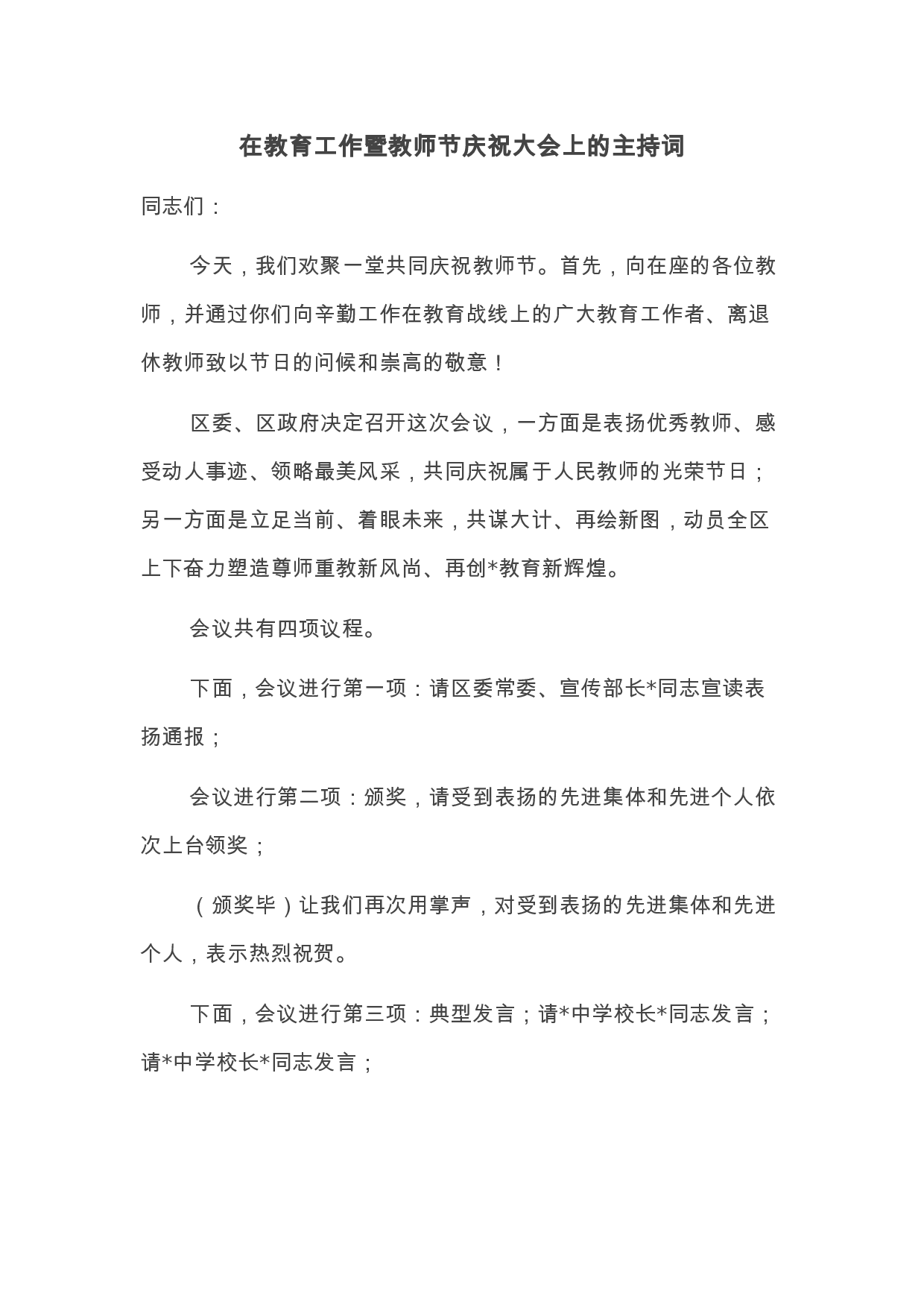 2021年度全县教育大会暨第37个教师节庆祝大会主持词