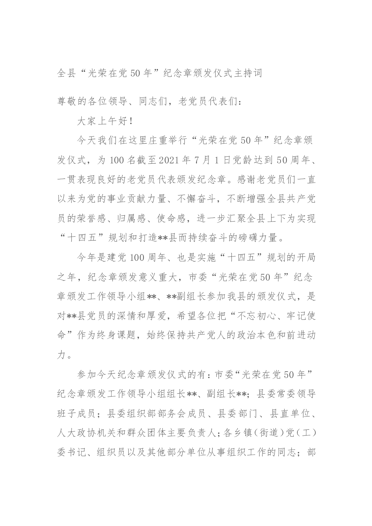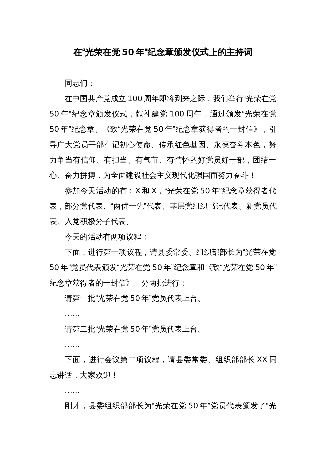 在全县“光荣在党50年“纪念章颁发仪式上的主持词同志们:在中国共产党成立100周年即将到来之际,我们举行全县“光荣在党50年”纪念章颁发仪式,献礼建党100周年,旨在通过颁发“光荣在党50年”纪念章、《致“光荣在党50年”纪念章获得者的一封信》,引导全县广大党员干部牢记初心使命、传承红色基因、永葆奋斗本色,努力争当有信仰、有担当、有气节、有情怀的好党员好干部,团结一心、奋力拼搏,为描绘好新时代XX改革发展新画卷而努力奋斗!参加今天活动的有:各乡镇党委组织员和县直单位党(工)委分管领导,“光荣在党50年”纪念章获得者代表,部分党代表、“两优一先”代表、基层党组织书记代表、新党员代表、入党积极分子...