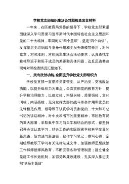 学校党支部组织生活会对照检查发言材料一年来,在区教育局党委的领导下,学校党支部紧紧围绕深入学习贯彻习近平新时代中国特色社会主义思想和党的二十大精神,牢固树立“四个意识”,坚定“四个自信”,发挥基层党组织战斗堡垒作用和党员先锋模范作用,对照党章,对照准则,对照民主生活会活动要求,认真查找学校领导班子和班子成员的差距和具体问题,边反思边整改现将对照检查情况汇报如下。一、突出政治功能,全面提升学校党支部组织力学校党支部一直坚持党要管党、从严治党,突出政治功能,以提升组织力为重点,全面贯彻党的教育方针,提升学校治理能力,以德立校,科研兴校,质量强校,文化润校,内涵亮校,充分发挥支部的战斗堡垒作用和党员...