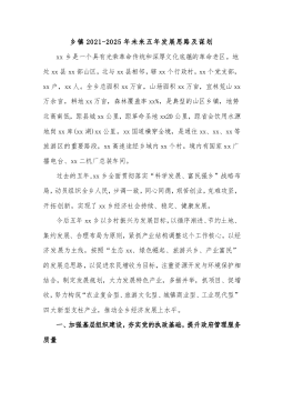 乡镇2021-2025年未来五年发展思路及谋划xx乡是一个具有光荣革命传统和深厚文化底蕴的革命老区。地处xx县xx部山区,北与xx县相邻,辖xx个行政村,xx个党支部,xx户,xx人。全乡总面积xx万亩,山场面积xx万亩,宜林荒山xx万余亩,耕地xx万亩,森林覆盖率xx%,是典型的山区乡镇,地势北高南低,距县城xx公里,距革命圣地xx20公里,距省会饮用水源地岗xx库(xx湖)xx公里。xx国道横穿全境,是通往xx、xx、xx等旅游区的重要路段,xx高速途经乡域内xx个村。境内有国家xx广播电台、xx二机厂总装车间。过去的五年,xx乡全面贯彻落实“科学发展、富民强乡”战略布局,动员组织全乡人民...
