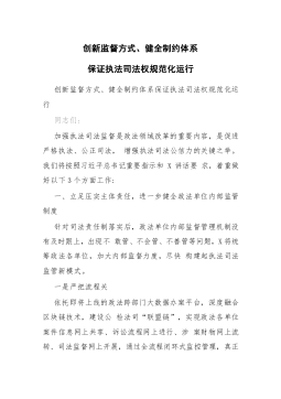 创新监督方式、健全制约体系保证执法司法权规范化运行创新监督方式、健全制约体系保证执法司法权规范化运行同志们:加强执法司法监督是政法领域改革的重要内容,是促进严格执法、公正司法,增强执法司法公信力的关键之举。我们将按照习近平总书记重要指示和X讲话要求,着重做好以下3个方面工作:一、立足压实主体责任,进一步健全政法单位内部监管制度针对司法责任制落实后,政法单位内部监督管理机制没有及时跟上,出现不敢管、不会管、不善管等问题,X将统筹政法各单位,加大内部监督力度,尽快构建起执法司法监管新模式。一是严把流程关依托即将上线的政法跨部门大数据办案平台,深度融合区块链技术,建设公检法司“联盟链”,实现政法各单...