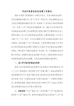 司法行政普法依法治理工作要点2021年是深入贯彻党的十九届五中全会、中央全面依法治国工作会议精神的关键之年,是“十四五”开局之年,是全面建设社会主义现代化国家新征程的开启之年,是向第二个百年奋斗目标进军的第一年,也是“八五”普法启动实施的第一年。2021年全县司法行政系统普法依法治理工作总的要求是:坚持以新时代中国特色社会主义思想为指导,深入学习宣传贯彻法治思想,全面贯彻党的十九大和十九届二中、三中、四中、五中全会精神以及中央全面依法治国工作会议精神,启动实施“八五”普法规划,认真贯彻落实2021年全市司法行政系统普法依法治理工作要点以及2021年全市普法依法治理工作要点,带头落实“谁执法谁普...