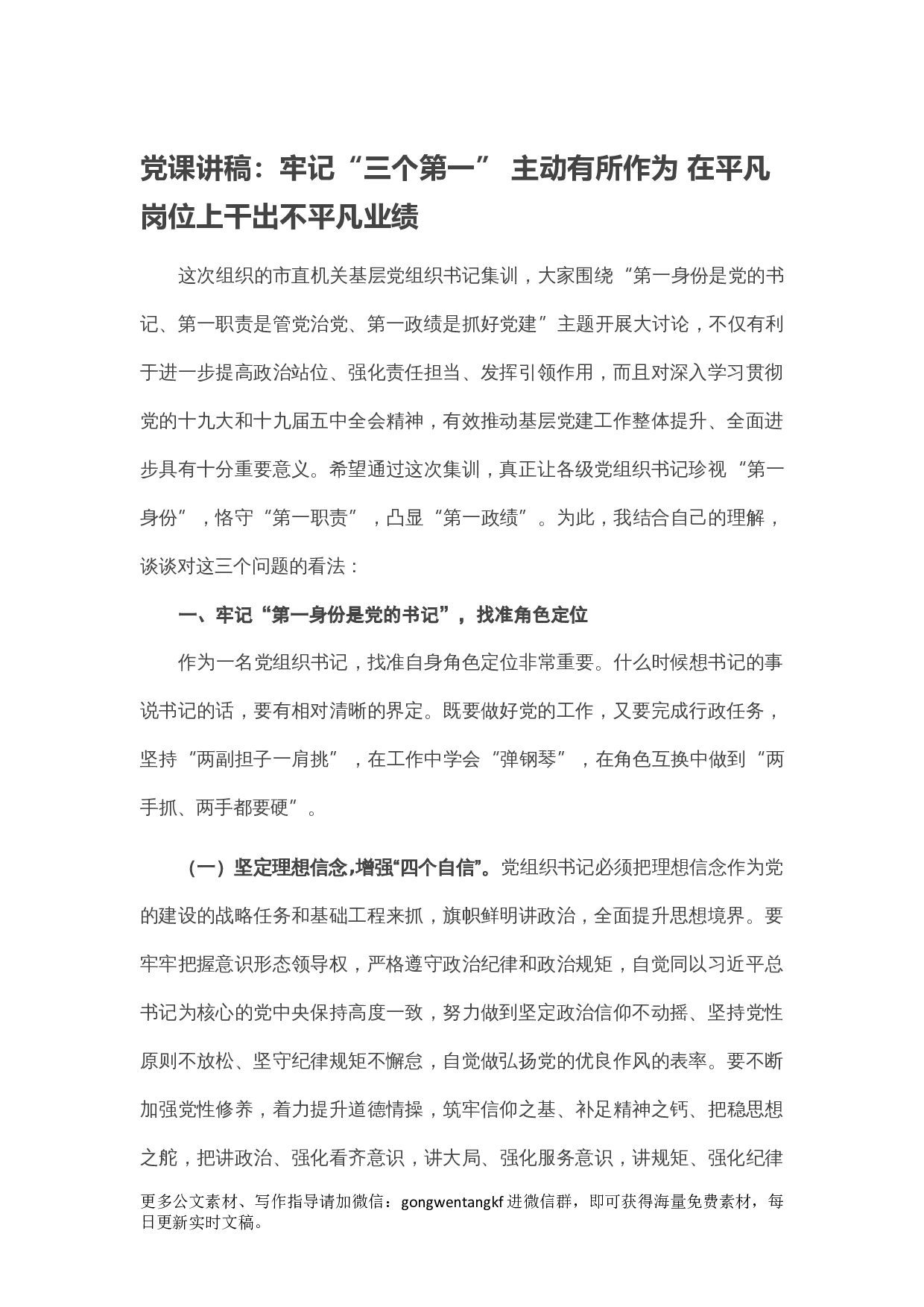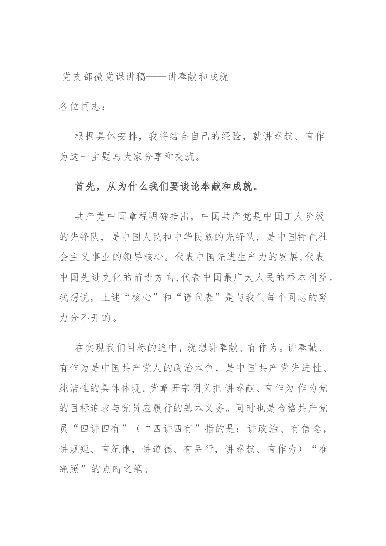党支部微党课讲稿——讲奉献和成就各位同志:根据具体安排,我将结合自己的经验,就讲奉献、有作为这一主题与大家分享和交流。首先,从为什么我们要谈论奉献和成就。共产党中国章程明确指出,中国共产党是中国工人阶级的先锋队,是中国人民和中华民族的先锋队,是中国特色社会主义事业的领导核心。代表中国先进生产力的发展,代表中国先进文化的前进方向,代表中国最广大人民的根本利益。我想说,上述“核心”和“谨代表”是与我们每个同志的努力分不开的。在实现我们目标的途中,就想讲奉献、有作为。讲奉献、有作为是中国共产党人的政治本色,是中国共产党先进性、纯洁性的具体体现。党章开宗明义把讲奉献、有作为作为党的目标追求与党员应履行...