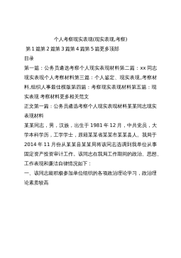 个人考察现实表现(现实表现,考察)第1篇第2篇第3篇第4篇第5篇更多顶部目录第一篇:公务员遴选考察个人现实表现材料第二篇:xx同志现实表现个人考察材料第三篇:个人鉴定、现实表现,考察材料,组织人事最佳模版第四篇:考察现实表现材料第五篇:现实表现考察材料更多相关范文正文第一篇:公务员遴选考察个人现实表现材料某某同志现实表现材料某某同志,男,汉族,出生于1981年12月,中共党员,大学本科学历,工学学士,原籍某某省某某市某某县人。我局于2014年11月份从某某县某某局将该同志选调到我单位从事固定资产投资审计工作。该同志在我局工作期间的政治、思想、工作表现和廉洁自律情况如下:一、该同志能积极参加单位...