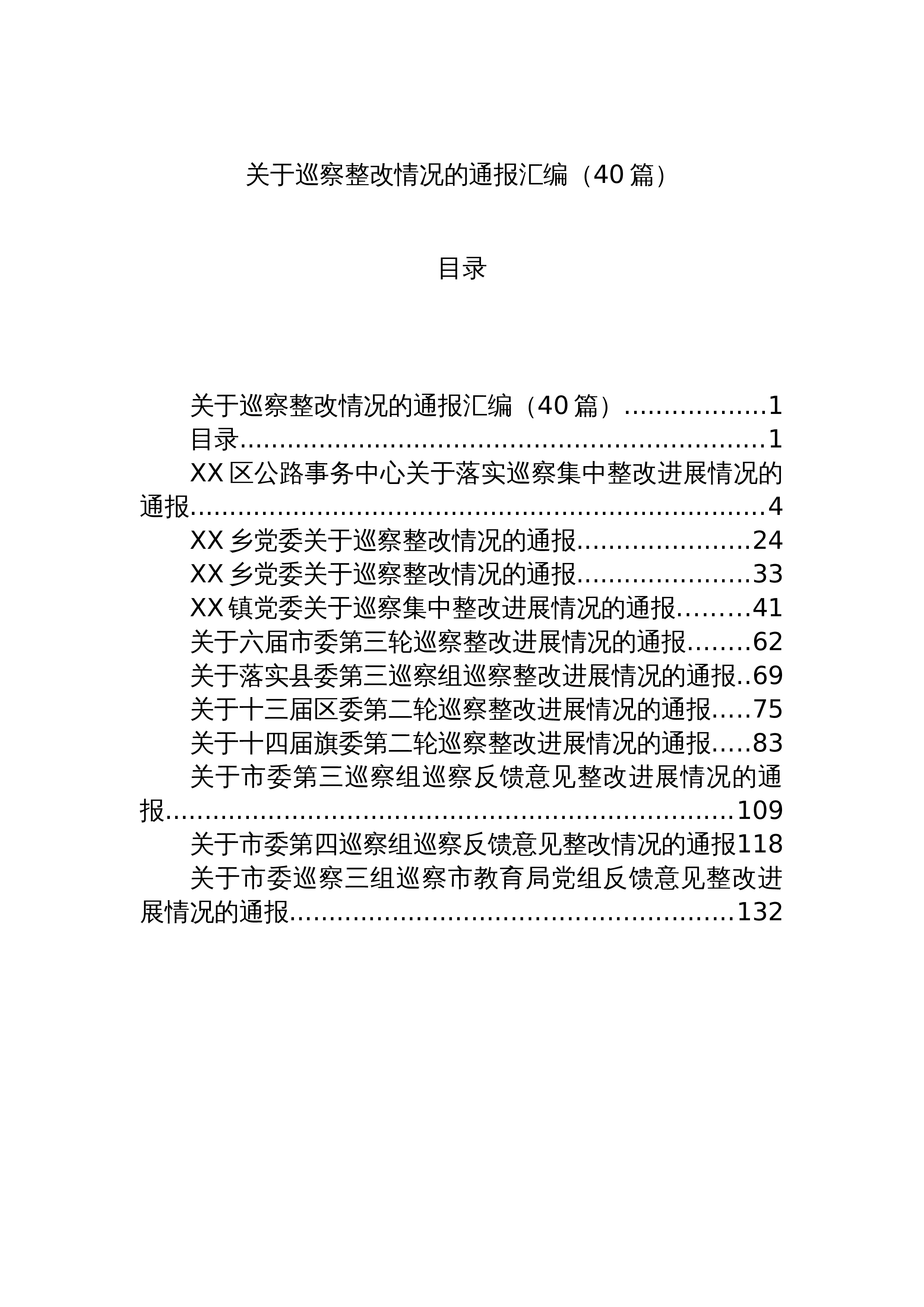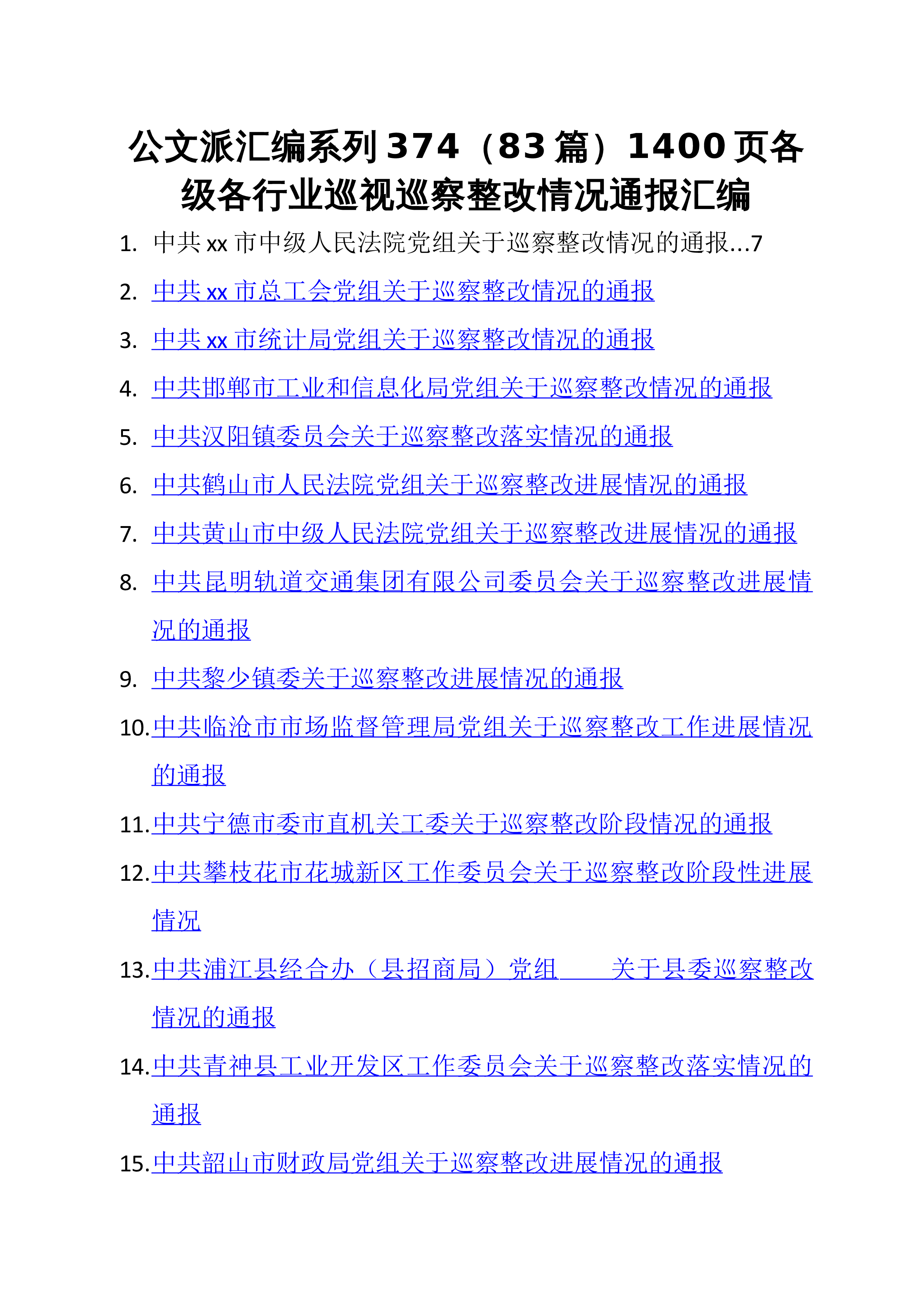 公文堂汇编系列374(83篇)1400页各级各行业巡视巡察整改情况通报汇编1.中共xx市中级人民法院党组关于巡察整改情况的通报...72.中共xx市总工会党组关于巡察整改情况的通报3.中共xx市统计局党组关于巡察整改情况的通报4.中共邯郸市工业和信息化局党组关于巡察整改情况的通报5.中共汉阳镇委员会关于巡察整改落实情况的通报6.中共鹤山市人民法院党组关于巡察整改进展情况的通报7.中共黄山市中级人民法院党组关于巡察整改进展情况的通报8.中共昆明轨道交通集团有限公司委员会关于巡察整改进展情况的通报9.中共黎少镇委关于巡察整改进展情况的通报10.中共临沧市市场监督管理局党组关于巡察整改工作进展情况的...