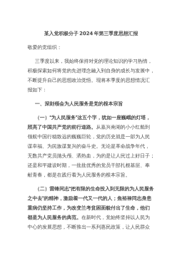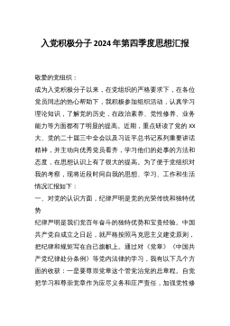 某入党积极分子2024年第三季度思想汇报敬爱的党组织:三季度以来,我始终保持对党的理论知识的学习热情,积极探索如何将党的先进理念融入到自身的成长与发展中,不断提升自己的思想政治觉悟。现将本季度的思想情况汇报如下:一、深刻领会为人民服务是党的根本宗旨(一)“为人民服务”这五个字,犹如一座巍峨的灯塔,照亮了中国共产党的前行道路。从嘉兴南湖的小小红船到领航中国行稳致远的巍巍巨轮,党的历史就是一部为人民谋幸福、为民族谋复兴的奋斗史。无论是革命战争年代,无数共产党员抛头颅、洒热血,为的是让人民过上好日子;还是和平建设时期,一批批优秀的党员干部扎根基层、奉献青春,都是在践行着为人民服务的根本宗旨。(二)雷...