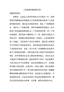 入党发展对象思想汇报敬爱的党组织:转眼间,从提交入党申请书到今天已将近一年,而我很荣幸地能被党支部确定为入党发展对象并参加了入党发展对象培训班。通过这次党校的培训,我从一个普通的群众,成长为一个发展对象,同时为能够更早地成为一名中国共产党员做好思想准备;从一个对党的崇拜者,到一个党的追随者,我对党的了解更深入了一层,我的马克思主义理论水平、思想政治觉悟得到进一步提高,入党动机得到进一步端正,而且提高了对自己的要求。通过深入系统地学习中国共产党的发展历史、党的章程及在新的历史条件下党的基本任务、目标,在心中进一步明确我们的党是中国工人阶级的先锋队,同时也是中国人民和中华民族的先锋队,是中国特色社...