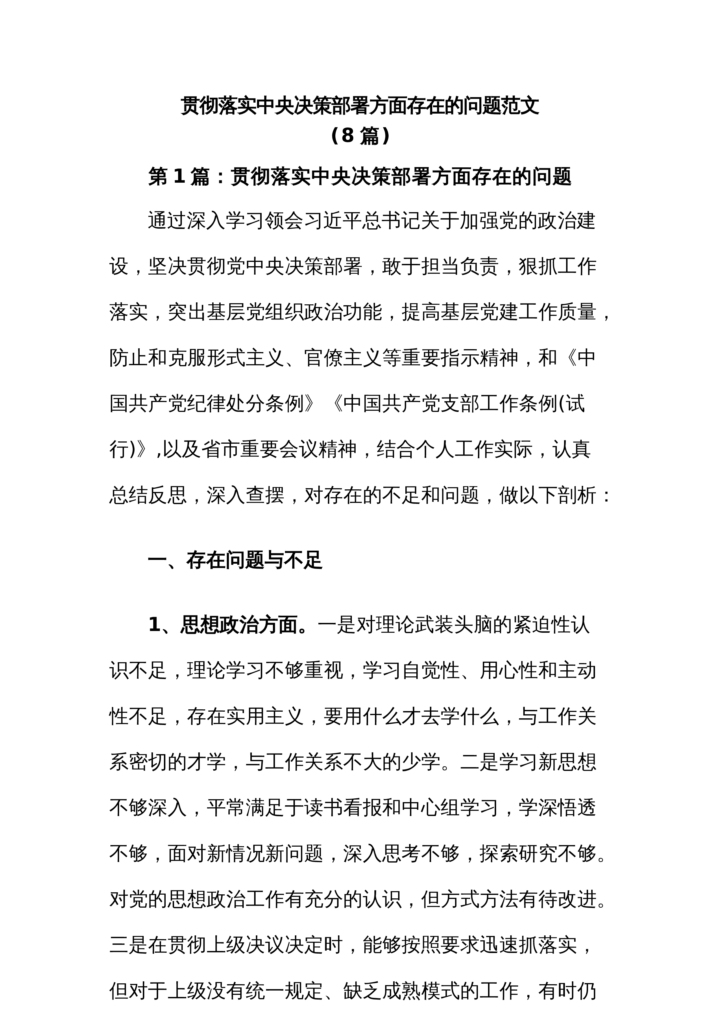(8篇)贯彻落实中央决策部署方面存在的问题范文