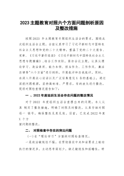 2023主题教育对照六个方面问题剖析原因及整改措施按照2023年主题教育专题组织生活会的要求,围绕此次组织生活会主题,会前认真学习了习近平新时代中国特色社会主义思想和党的二十大精神,重温了党的二十大报告、党章、《习近平著作选读》《习近平新时代中国特色社会主义思想专题摘编》,结合工作实际,紧扣会议主题,认真从理论学习、政治素质、能力本领、担当作为、工作作风、廉洁自律等"六个方面"进行剖析,开展批评和自我批评。同时,在深入开展谈心谈话以及广泛征集意见X条的基础上,通过深挖问题根源,坚持高标准、严要求,有的放矢进行整改,现将对照检查情况报告如下:一、2022年度组织生活会存在问题的整改情况对于202...