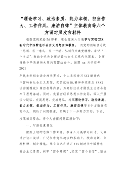 “理论学习、政治素质、能力本领、担当作为、工作作风、廉洁自律”主体教育等六个方面对照发言材料根据党的贰拾DA部署,在全党深入开展学习贯彻XXX新时代中国特色社会主义思想主体教育,用党的创新理论统一思想、统一意志、统一行动,弘扬伟大建党精神,牢记“三个务必",推动全党为全面建设社会主义现代化国家、全面推进中华民族伟大复兴而团结奋斗。按照xx关于召开2023年民主组织生活会相关要求,个人系统学习XXX新时代中国特色社会主义思想、党的贰拾DA精神和党章及《XXX谈治国理政》第四卷等内容,为开好这次专题民主生活会打牢了思想基础。同时,我紧密联系思想工作实际,深入开展谈心谈话、交流思想、交换意见,对照理...