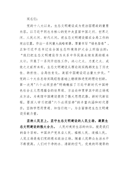 同志们:党的十八大以来,生态文明建设成为党治国理政的重要内容,以习近平同志为核心的党中央直面中国之问、世界之问、人民之问、时代之问,把生态文明建设摆在全局工作的突出位置,作出一系列重大战略部署,厚重书写“绿色答卷”。正如习近平总书记在全国生态环境保护大会上所指出的:“我们把生态文明建设作为关系中华民族永续发展的根本大计,开展了一系列开创性工作,决心之大、力度之大、成效之大前所未有,生态文明建设从理论到实践都发生了历史性、转折性、全局性变化,美丽中国建设迈出重大步伐。”党的二十大在总结实践经验基础上继续推进党的理论创新,第一次用"六个必须坚持"明确概括了习近平新时代中国特色社会主义思想蕴含的世界...