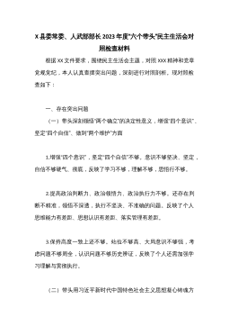 X县委常委、人武部部长2023年度“六个带头”民主生活会对照检查材料  根据XX文件要求,围绕民主生活会主题,对照XXX精神和党章党规党纪,本人认真查摆突出问题,深刻进行对照剖析。现对照检查如下:  一、存在突出问题  (一)带头深刻领悟“两个确立”的决定性意义,增强“四个意识”、坚定“四个自信”、做到“两个维护”方面  1.增强“四个意识”,坚定“四个自信”不够。意识不够坚决、坚定,自信不够硬气、彻底,反映了学习不够,理解不够,思悟行不够。  2.提高政治判断力、政治领悟力、政治执行力不够。还存在判断不精准,领悟不深透,执行不坚决、不准确的问题。反映了个人思维能力有差距、思想认识有差距、落实...