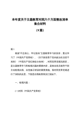 本年度关于主题教育对照六个方面整改清单集合材料(9篇)篇1  根据“不忘初心、牢记使命”主题教育学习的安排,重点学习了《中国共产党章程》、《关于新形势下党内政治生活若干准则》《中国共产党纪律处分条例》,对照党章党规找差距,是主题教育学习和检视问题的重要内容,是推动党员领导干部主动检视自我、自觉修正错误的重要措施。我对照党章党规进行了深刻的反思,下面是自我检查情况汇报如下。  一、检视问题:  (一)对照《中国共产党章程》  1、理论学习主动性不强,缺乏主动学习意识,一般是要求学习什么我就学习什么,有针对性的、主动搜集材料的拓展学习不多;  2、理论学习系统性不强,对习近平新时代中国特色社会主义...
