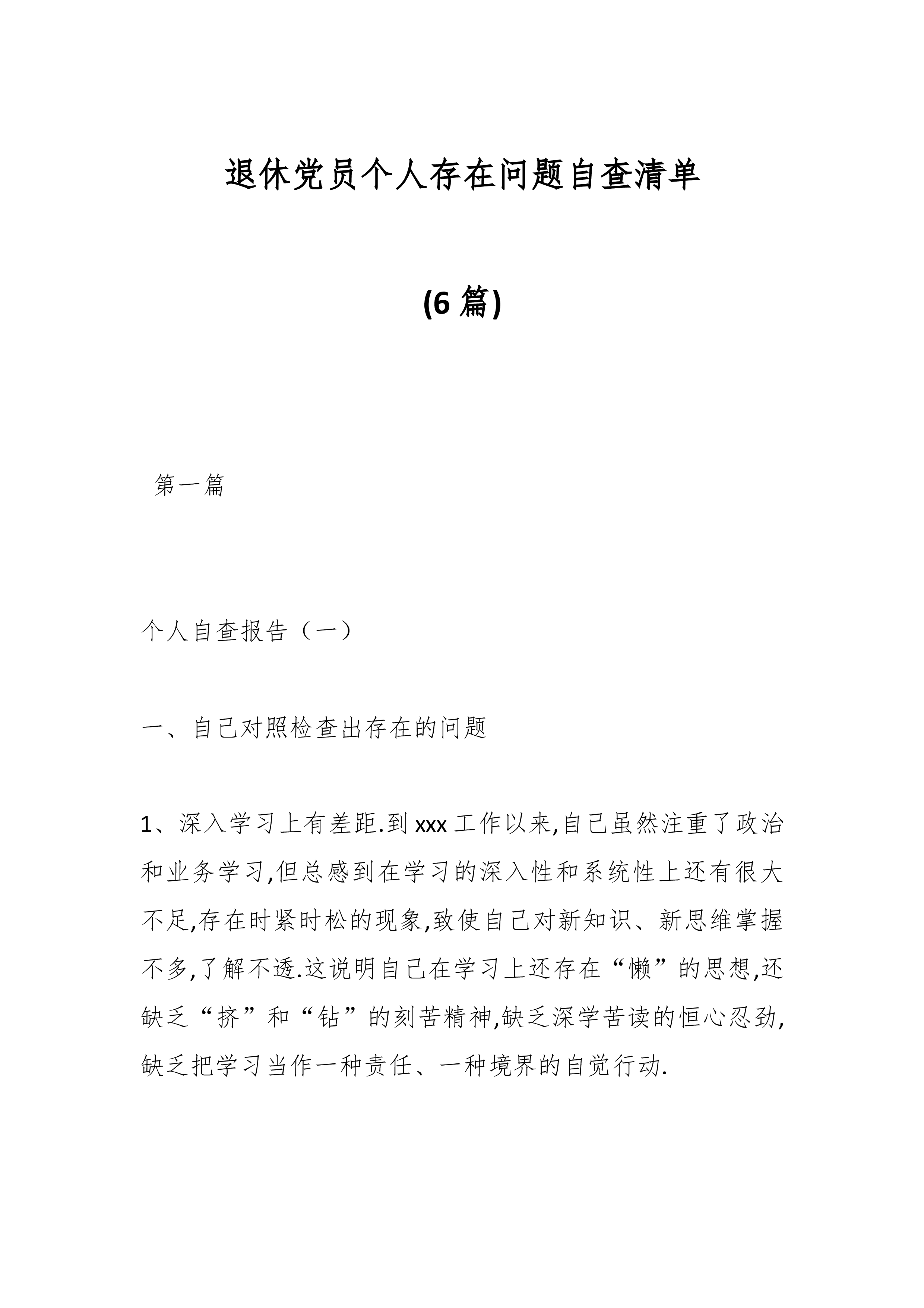 退休党员个人存在问题自查清单(6篇)第一篇个人自查报告(一)一、自己对照检查出存在的问题1、深入学习上有差距.到xxx工作以来,自己虽然注重了政治和业务学习,但总感到在学习的深入性和系统性上还有很大不足,存在时紧时松的现象,致使自己对新知识、新思维掌握不多,了解不透.这说明自己在学习上还存在“懒”的思想,还缺乏“挤”和“钻”的刻苦精神,缺乏深学苦读的恒心忍劲,缺乏把学习当作一种责任、一种境界的自觉行动.2、工作作风上有差距.一是认为自己是工作多年了,有时产生松口气、想歇歇的念头,致使工作有时不够主动,满足于完成领导交办的任务,满足于面上不出问题,创新意识淡化,忽视了工作的积极性、主动性、创造性...