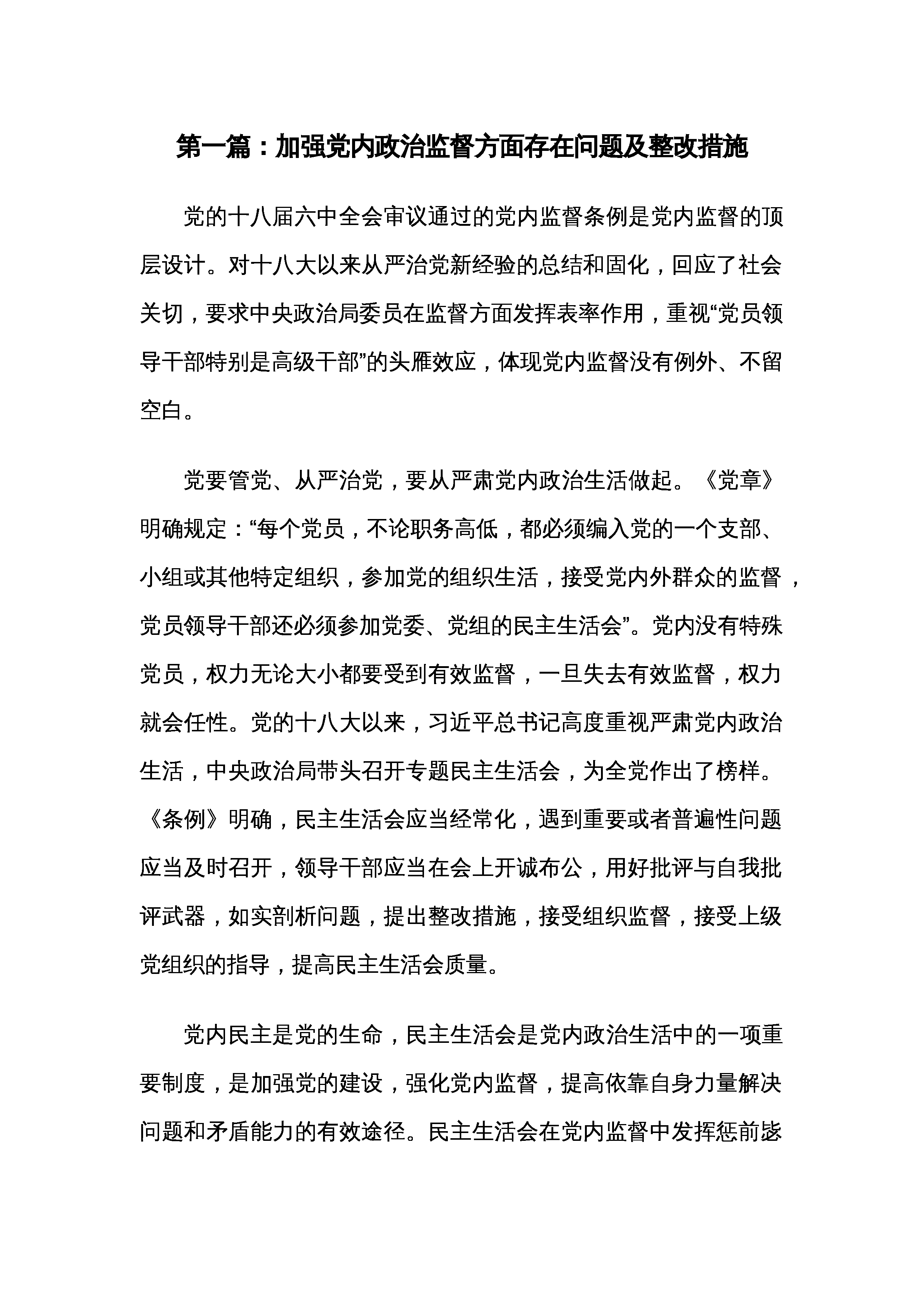第一篇:加强党内政治监督方面存在问题及整改措施党的十八届六中全会审议通过的党内监督条例是党内监督的顶层设计。对十八大以来从严治党新经验的总结和固化,回应了社会关切,要求中央政治局委员在监督方面发挥表率作用,重视“党员领导干部特别是高级干部”的头雁效应,体现党内监督没有例外、不留空白。党要管党、从严治党,要从严肃党内政治生活做起。《党章》明确规定:“每个党员,不论职务高低,都必须编入党的一个支部、小组或其他特定组织,参加党的组织生活,接受党内外群众的监督,党员领导干部还必须参加党委、党组的民主生活会”。党内没有特殊党员,权力无论大小都要受到有效监督,一旦失去有效监督,权力就会任性。党的十八大以来...