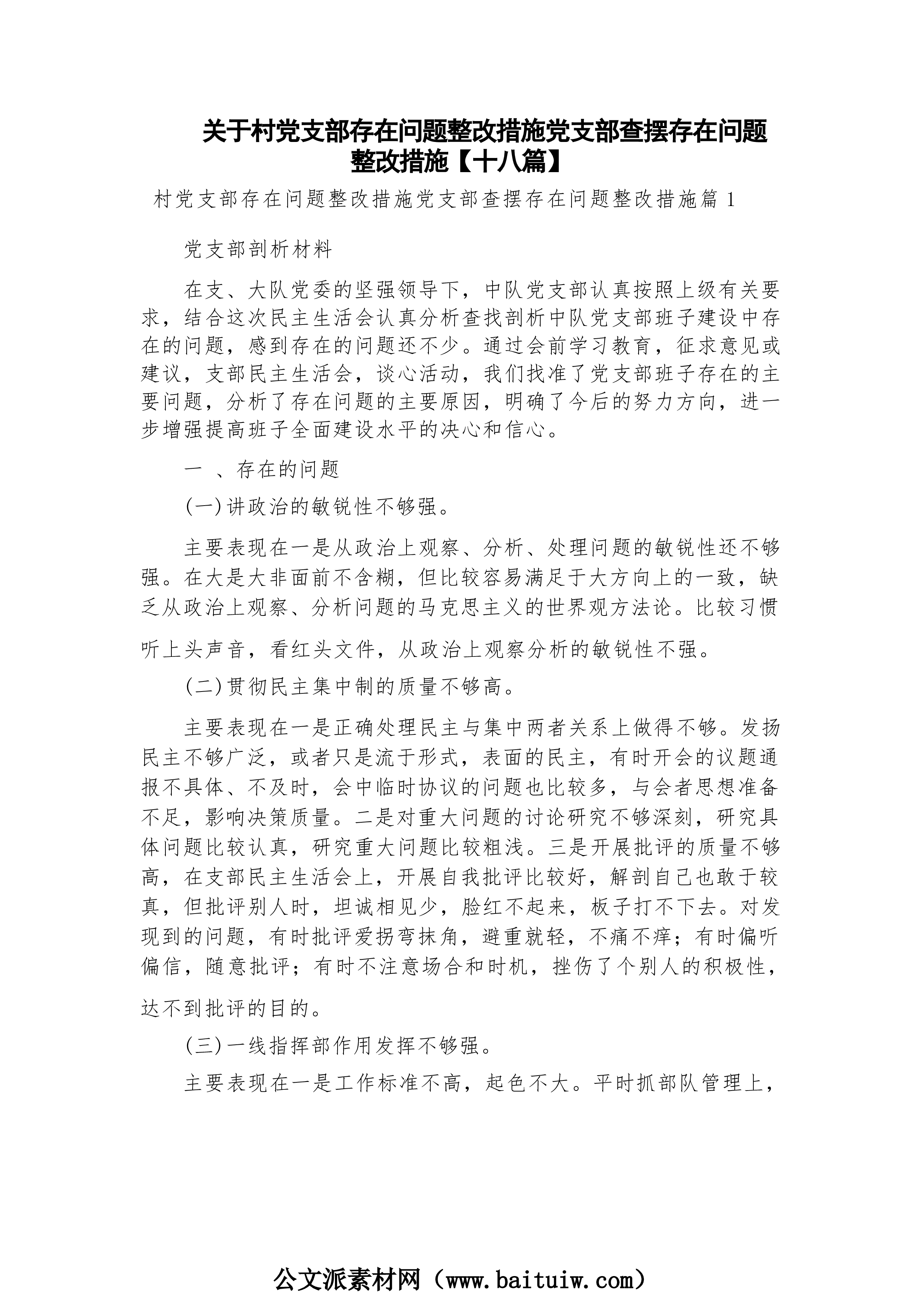 关于村党支部存在问题整改措施党支部查摆存在问题整改措施【十八篇】村党支部存在问题整改措施党支部查摆存在问题整改措施篇1党支部剖析材料在支、大队党委的坚强领导下,中队党支部认真按照上级有关要求,结合这次民主生活会认真分析查找剖析中队党支部班子建设中存在的问题,感到存在的问题还不少。通过会前学习教育,征求意见或建议,支部民主生活会,谈心活动,我们找准了党支部班子存在的主要问题,分析了存在问题的主要原因,明确了今后的努力方向,进一步增强提高班子全面建设水平的决心和信心。一、存在的问题(一)讲政治的敏锐性不够强。主要表现在一是从政治上观察、分析、处理问题的敏锐性还不够强。在大是大非面前不含糊,但比较容...