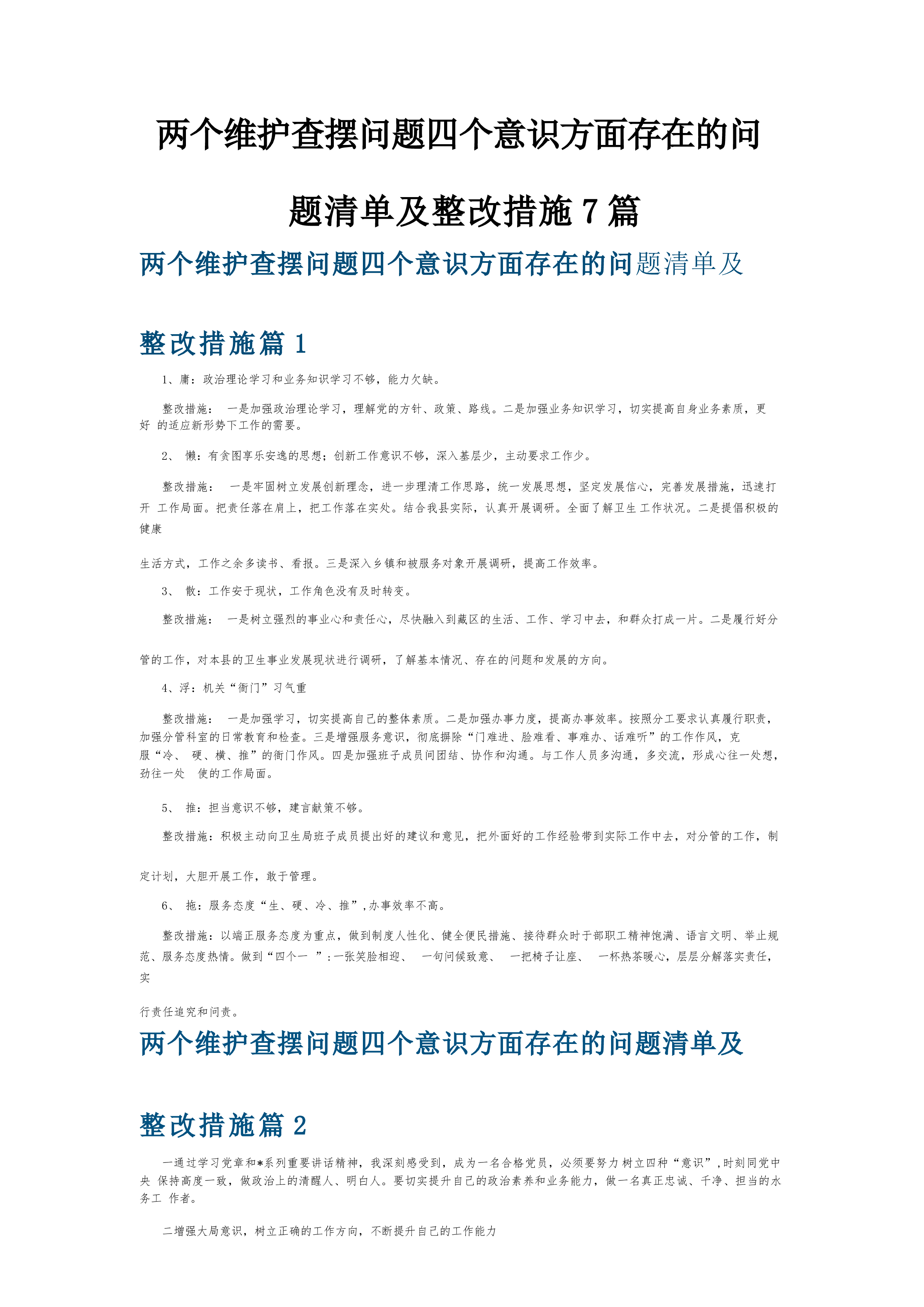 两个维护查摆问题四个意识方面存在的问题清单及整改措施7篇