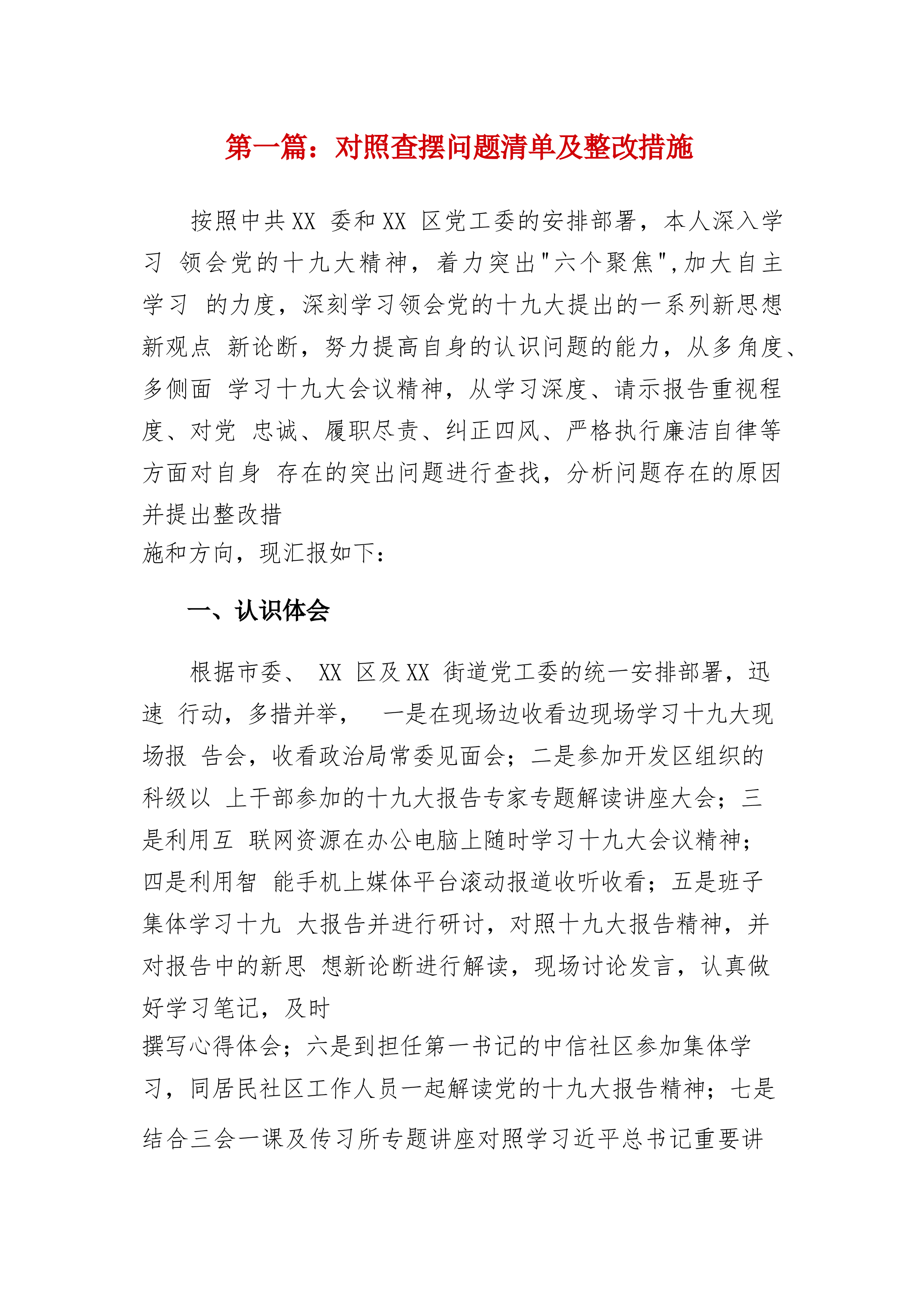 第一篇:对照查摆问题清单及整改措施按照中共XX委和XX区党工委的安排部署,本人深入学习领会党的十九大精神,着力突出"六个聚焦",加大自主学习的力度,深刻学习领会党的十九大提出的一系列新思想新观点新论断,努力提高自身的认识问题的能力,从多角度、多侧面学习十九大会议精神,从学习深度、请示报告重视程度、对党忠诚、履职尽责、纠正四风、严格执行廉洁自律等方面对自身存在的突出问题进行查找,分析问题存在的原因并提出整改措施和方向,现汇报如下:一、认识体会根据市委、XX区及XX街道党工委的统一安排部署,迅速行动,多措并举,一是在现场边收看边现场学习十九大现场报告会,收看政治局常委见面会;二是参加开发区组织的科...