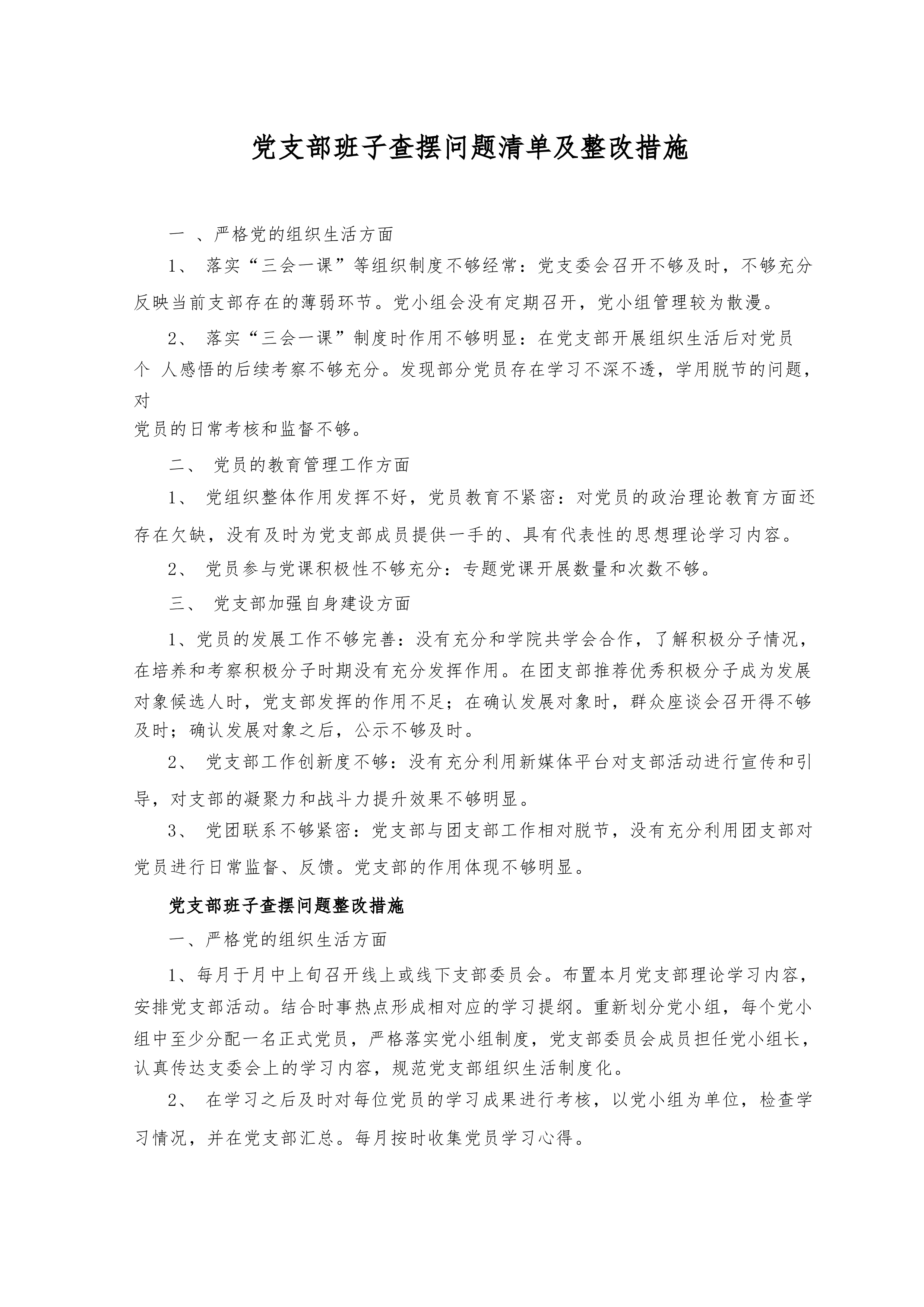 党支部班子查摆问题清单及整改措施一、严格党的组织生活方面1、落实“三会一课”等组织制度不够经常:党支委会召开不够及时,不够充分反映当前支部存在的薄弱环节。党小组会没有定期召开,党小组管理较为散漫。2、落实“三会一课”制度时作用不够明显:在党支部开展组织生活后对党员个人感悟的后续考察不够充分。发现部分党员存在学习不深不透,学用脱节的问题,对党员的日常考核和监督不够。二、党员的教育管理工作方面1、党组织整体作用发挥不好,党员教育不紧密:对党员的政治理论教育方面还存在欠缺,没有及时为党支部成员提供一手的、具有代表性的思想理论学习内容。2、党员参与党课积极性不够充分:专题党课开展数量和次数不够。三、党...