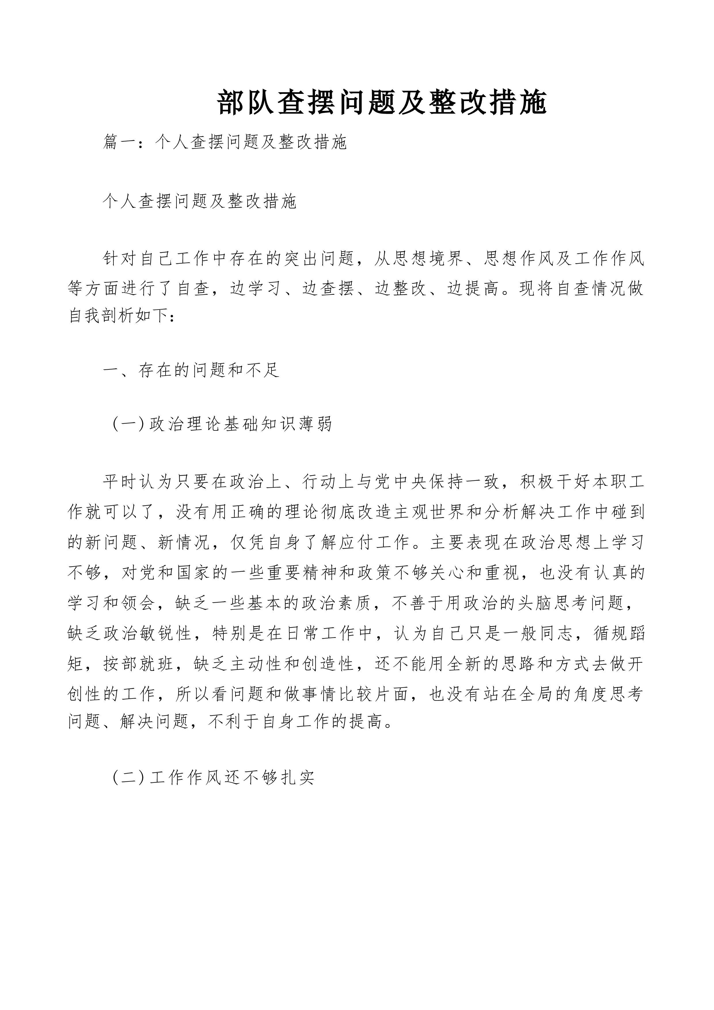 部队查摆问题及整改措施篇一:个人查摆问题及整改措施个人查摆问题及整改措施针对自己工作中存在的突出问题,从思想境界、思想作风及工作作风等方面进行了自查,边学习、边查摆、边整改、边提高。现将自查情况做自我剖析如下:一、存在的问题和不足(一)政治理论基础知识薄弱平时认为只要在政治上、行动上与党中央保持一致,积极干好本职工作就可以了,没有用正确的理论彻底改造主观世界和分析解决工作中碰到的新问题、新情况,仅凭自身了解应付工作。主要表现在政治思想上学习不够,对党和国家的一些重要精神和政策不够关心和重视,也没有认真的学习和领会,缺乏一些基本的政治素质,不善于用政治的头脑思考问题,缺乏政治敏锐性,特别是在日常...