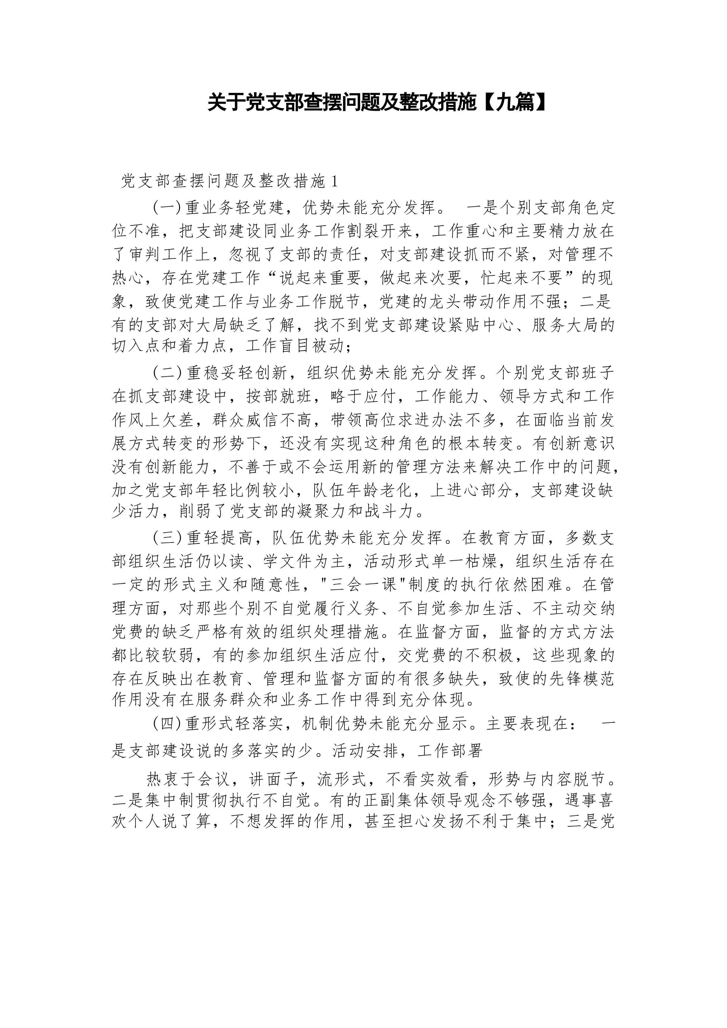 关于党支部查摆问题及整改措施【九篇】党支部查摆问题及整改措施1(一)重业务轻党建,优势未能充分发挥。一是个别支部角色定位不准,把支部建设同业务工作割裂开来,工作重心和主要精力放在了审判工作上,忽视了支部的责任,对支部建设抓而不紧,对管理不热心,存在党建工作“说起来重要,做起来次要,忙起来不要”的现象,致使党建工作与业务工作脱节,党建的龙头带动作用不强;二是有的支部对大局缺乏了解,找不到党支部建设紧贴中心、服务大局的切入点和着力点,工作盲目被动;(二)重稳妥轻创新,组织优势未能充分发挥。个别党支部班子在抓支部建设中,按部就班,略于应付,工作能力、领导方式和工作作风上欠差,群众威信不高,带领高位求...