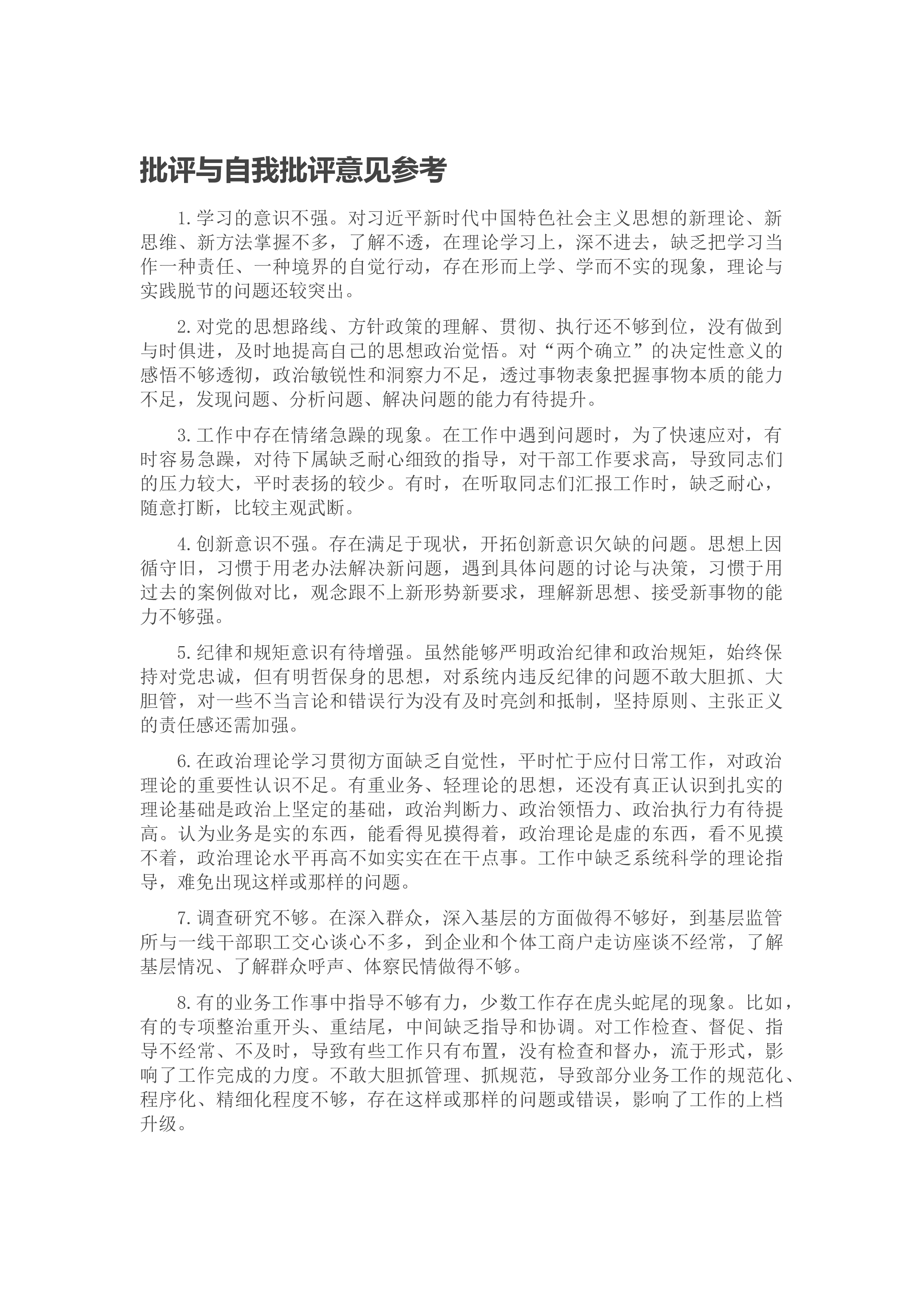 关于党员互相批评意见50条互相批评意见200条【六篇】党员互相批评意见50条互相批评意见200条篇11、业务学习不够。应加强业务知识的学习更新,更好地指导分管工作。2、进取心不足,有些工作仅限于听汇报,主动安排的少,被动应付的多。3、生活上艰苦奋斗精神不够,有时有吃请和公车私用现象。4、工作纪律坚持不够,有早退现象。对XX同志的批评意见21、工作上缺少进取、创新精神,满足于现状。2、习惯于当"甩手掌柜",分管工作指导不够,抓的不细。如:文书把关不严,有时有出错的现象。3、有时碍于情面有参加宴请的现象。4、也存在公车私用现象。对XX同志的批评意见31、业务学习不足。应加强业务知识尤其是计算机知识...