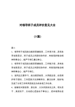 对领导班子成员评价意见大全(3篇)篇1:1、领导班子成员政治素质普遍较高,工作潜力强,具有改革创新意识,班子成员之间团结协作好,有较强的敬业精神和事业心,能严于律己廉洁奉公。2、领导班子成员政治素质普遍较高,工作能力强,具有改革创新意识,班子成员之间团结协作好,有较强的敬业精神和事业心,能严于律己。3、该同志注重学习,政治素质较高,大局观念强,自觉维护班子团结,工作思路方法清晰得当,廉洁自律,较好地完成了分管工作和局党组交办的各项工作任务。4、能够应对新形势,新任务,大兴求真务实之风,埋头苦干,真抓实干,主动把心思放在干事业上,把本领用在促发展上,把功夫下到狠抓落实上,以创造性工作促进经济社会...