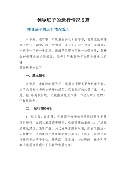 领导班子的运行情况5篇领导班子的运行情况篇1一年来,在市委、市政府的关心和指导下,我局党政领导班子进行了调整,班子结构进一步优化,战斗力进一步增强,一把手作用进一步发挥,新班子呈现出团结一心谋发展,聚精会神搞建设的大好局面。现将1年来我局党政领导班子运行情况分析报告如下:一、基本情况在市委、市政府的领导下,我局班子配备更加科学年轻。班子成员都有多岗位锻炼的经历,既能较好的处理“重、难、急、险"等突发问题,又能圆满完成市委、市政府所下达的工作目标任务。二、运行情况分析1、抓主线、谋发展。党政领导班子始终坚持以科学发展观为统领,在深入基层调查研究,吃透民情的基础上,广泛征求意见建议,集思广益,共议...