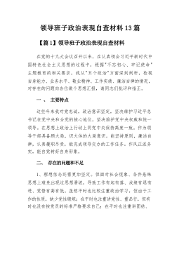 领导班子政治表现自查材料13篇【篇1】领导班子政治表现自查材料在党的十九大会议召开以来,在认真领会习近平新时代中国特色社会主义思想的过程中,根据"不忘初心、牢记使命"主题教育的相关要求,我从"五个政治"方面深刻剖析,检视自身能力、业务水平、敬业精神、工作实绩、廉洁自律的情况,对存在的问题向各位做个思想汇报,请同志们批评和指正。一、主要特点这些年来我对党忠诚,政治意识坚定,坚决维护习近平总书记在党中央和全党的核心地位,坚决维护党中央权威和统一领导。在思想上政治上行动上同党中央保持高度一致。作为领导干部具备顾大局,识大体的大局意识。能坚持原则,廉洁自律,认真履职尽责,能完成领导交办的工作任务。作风...