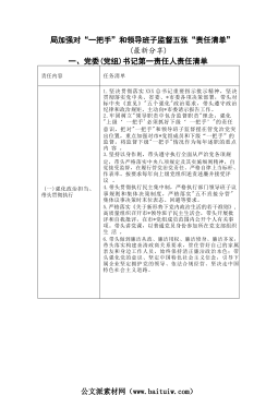 局加强对“一把手”和领导班子监督五张“责任清单”(最新分享)一、党委(党组)书记第一责任人责任清单责任内容任务清单(一)强化政治担当、带头贯彻执行1.坚决贯彻落实习近平总书记重要指示批示精神,坚决贯彻落实党中央、省委、*市委各项决策部署,带头对标中央《意见》"五个强化"政治要求,带头遵守政治纪律和政治规矩,主动向*市委请示报告工作。2.牢固树立"领导职责中包含监督职责"理念,强化"上级‘一把手'必须抓好下级‘一把手’"的责任意识,把对"一把手"和领导班子监督摆在管党治党突出位置,重点加强对市*党组成员和下级“一把手”的监督。将监督下级"一把手"情况作为每年述职的重点内容。3.坚持以身作则,带头...