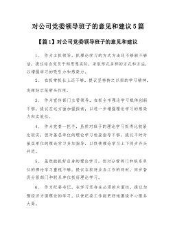 对公司党委领导班子的意见和建议5篇【篇1】对公司党委领导班子的意见和建议1、作为主抓领导,抓理论学习的方式方法还不够新不够活,提议结合党员干部思想实际,采取形式多样的方式和方法,以增强学习的吸引力和感染力。2、在抓常抓长上还不够,提议坚持持之以恒的学习精神,发挥好示范带头作用。3、作为宣传部门主管领导,在抓全市理论学习载体创新不够,提议在这方面加强探索,以进一步增强理论学习的感染力和实效性。4、作为党委一把手,虽然对班子的理论学习抓得比较紧比较实,但对基层单位的理论学习检查指导不够,提议平时对基层单位的理论学习多加指导,以促使理论学习上下同步齐头并进。5、虽然能抓好自身的理论学习,但对分管部门...