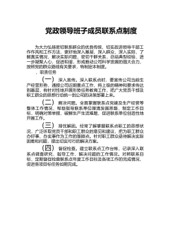 党政领导班子成员联系点制度为大力弘扬密切联系群众的优良传统,切实改进领导干部工作作风和工作方法,更好地深入基层,深入群众,深入实际,了解真实情况,解决实际问题,密切干群关系,总结典型经验,进一步凝聚人心,促进和谐,形成推动公司科学发展的强大合力,按照党的群众路线有关要求,特制定本制度。、职责任务(一)深入宣传。深入联系点时,要宣传公司当前生产经营形势,通报公司近期重点工作,将上级的精神和要求传达到基层,有针对性地开展形势任务教育工作,把广大党员干部及职工群众的思想行动统一到公司的决策部署上来。(二)解决问题。全面掌握联系点党建及生产经营等整体工作情况,帮助指导联系单位理清发展思路,制定工作目标...
