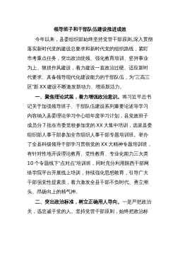 领导班子和干部队伍建设推进成效今年以来,县委组织部始终坚持党管干部原则,深入贯彻落实新时代党的建设总要求和新时代党的组织路线,紧盯市考重点任务,突出政治统领、强化教育培训、坚持事业为上、狠抓作风建设,着力建设一直政治过硬、适应新时代要求、具备领导现代化建设能力的千部队伍,为“三高三区”新XX建设不断激发新动力、增添新活力。一、聚焦理论武装,着力增强政治意识。将习近平总书记关于加强领导班子、干部队伍建设系列重要论述等学习内容纳入县委理论学习中心组年度学习计划,县党政班子成员分7批在市委党校参加党的XX大集中培训,选派县委组织部人事干部参加全市组织人事干部专题培训班。举办了全县科级领导干部学习贯彻...