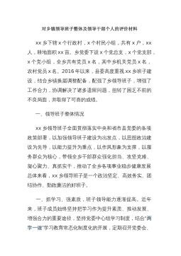 对乡镇领导班子整体及领导干部个人的评价材料xx乡下辖x个行政村,x个村民小组,共有x户,xx人,耕地面积xx亩。乡党委下设x个党总支,x个党支部,x个党小组,全乡共有党员x名,其中乡机关党员x名,农村党员x名。2016年以来,县委高度重视xx乡班子建设,结合乡镇换届调整配备,配强了乡领导班子,增强了工作合力,协调解决了诸多遗留问题,扭转了困乏不前的不良局面,并取得了可喜的成绩。一、领导班子整体情况xx乡领导班子全面贯彻落实中央和省市县党委的各项政策部署,以加强领导班子建设为出发点,以思想政治建设为先导,以能力提升为重点,以作风形象为支撑,以服务群众为核心,带领全乡干部群众强化担当、攻坚克难、凝...