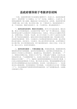 县政府领导班子考核评价材料一年来,县政府领导班子在县委的正确领导下,在县人大、县政协的监督支持下,团结带领广大干部群众,以“**”为目标,迎难而上、主动作为,各项事业都取得了重大进展,圆满完成了各项目标任务。总体看,县政府领导班子凝聚力强、战斗力强、执行落实力强,是一个团结有力、锐意进取的班子,是一个务实创业、勤政为民的班子,是一个实绩突出、群众满意的班子。一、始终坚持党的领导,整体作用发挥好。把学习作为提高素质、解决问题、推动工作的重要途径,认真组织开展“两学一做”学习教育活动,并通过组织参加县委中心组集体学习和政府全体会、党组会、常务会及专题研讨等形式,定期学理论、学政策、学法律,深入学习...