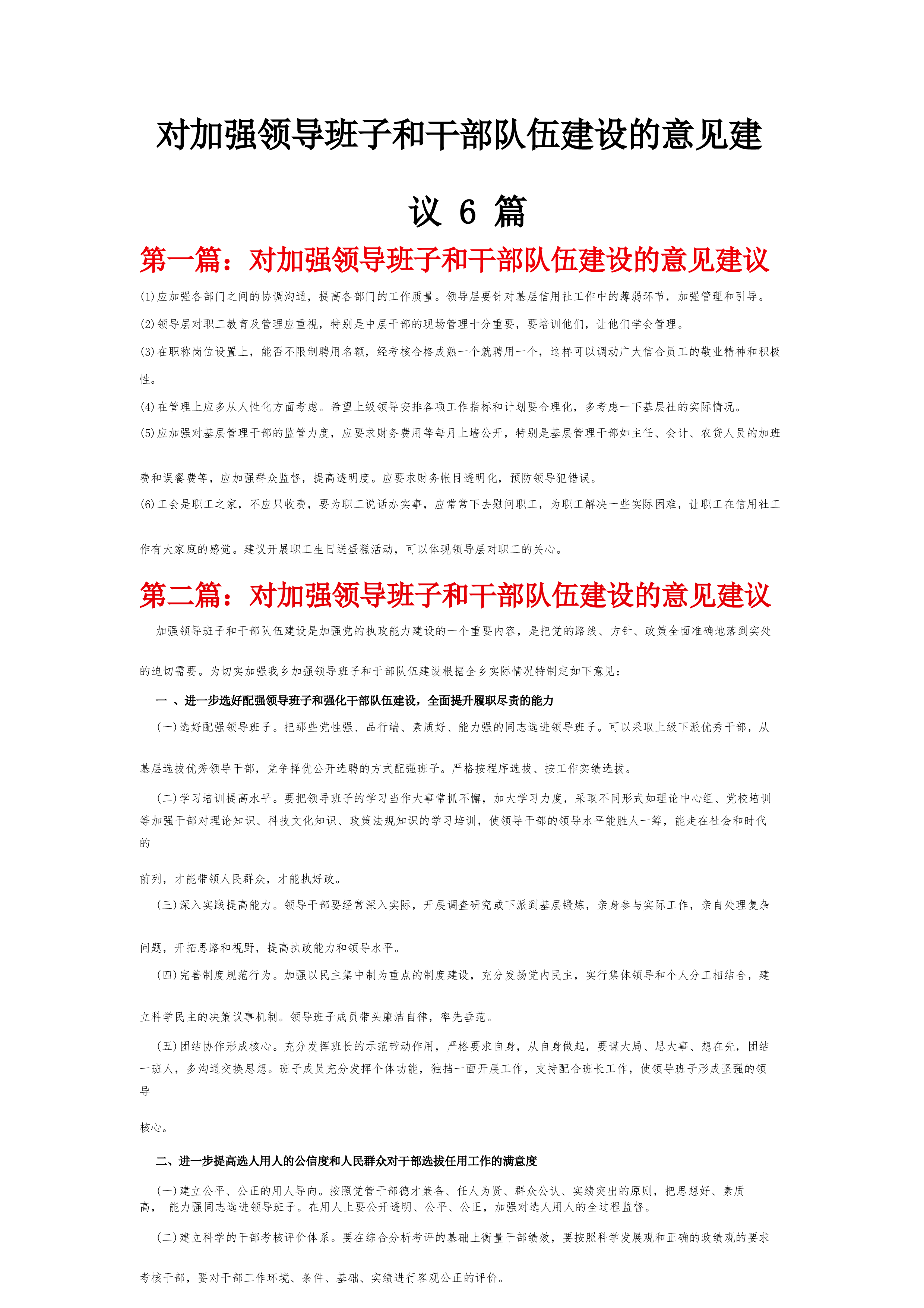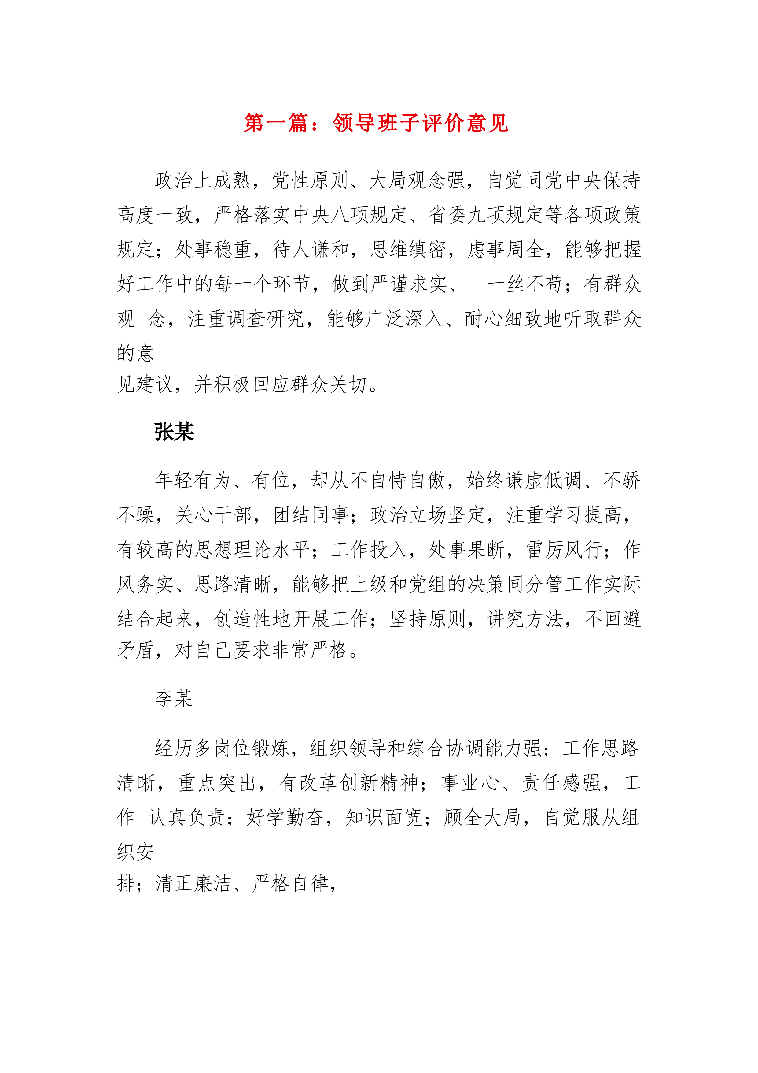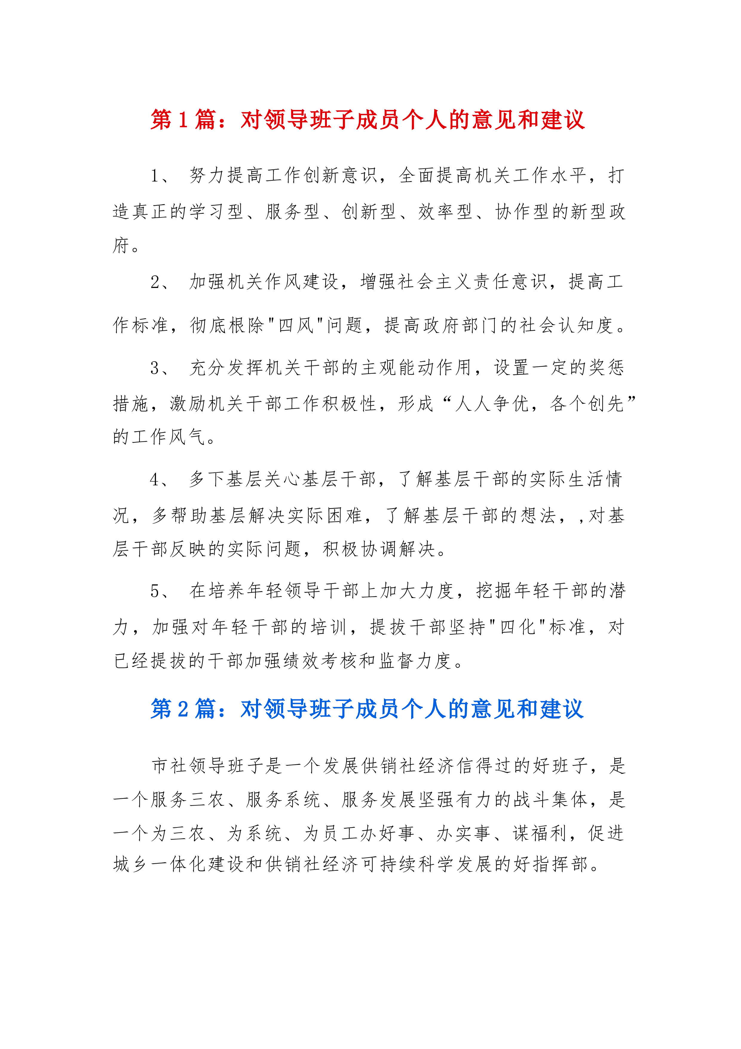 第1篇:对领导班子成员个人的意见和建议1、努力提高工作创新意识,全面提高机关工作水平,打造真正的学习型、服务型、创新型、效率型、协作型的新型政府。2、加强机关作风建设,增强社会主义责任意识,提高工作标准,彻底根除"四风"问题,提高政府部门的社会认知度。3、充分发挥机关干部的主观能动作用,设置一定的奖惩措施,激励机关干部工作积极性,形成“人人争优,各个创先”的工作风气。4、多下基层关心基层干部,了解基层干部的实际生活情况,多帮助基层解决实际困难,了解基层干部的想法,,对基层干部反映的实际问题,积极协调解决。5、在培养年轻领导干部上加大力度,挖掘年轻干部的潜力,加强对年轻干部的培训,提拔干部坚持"...