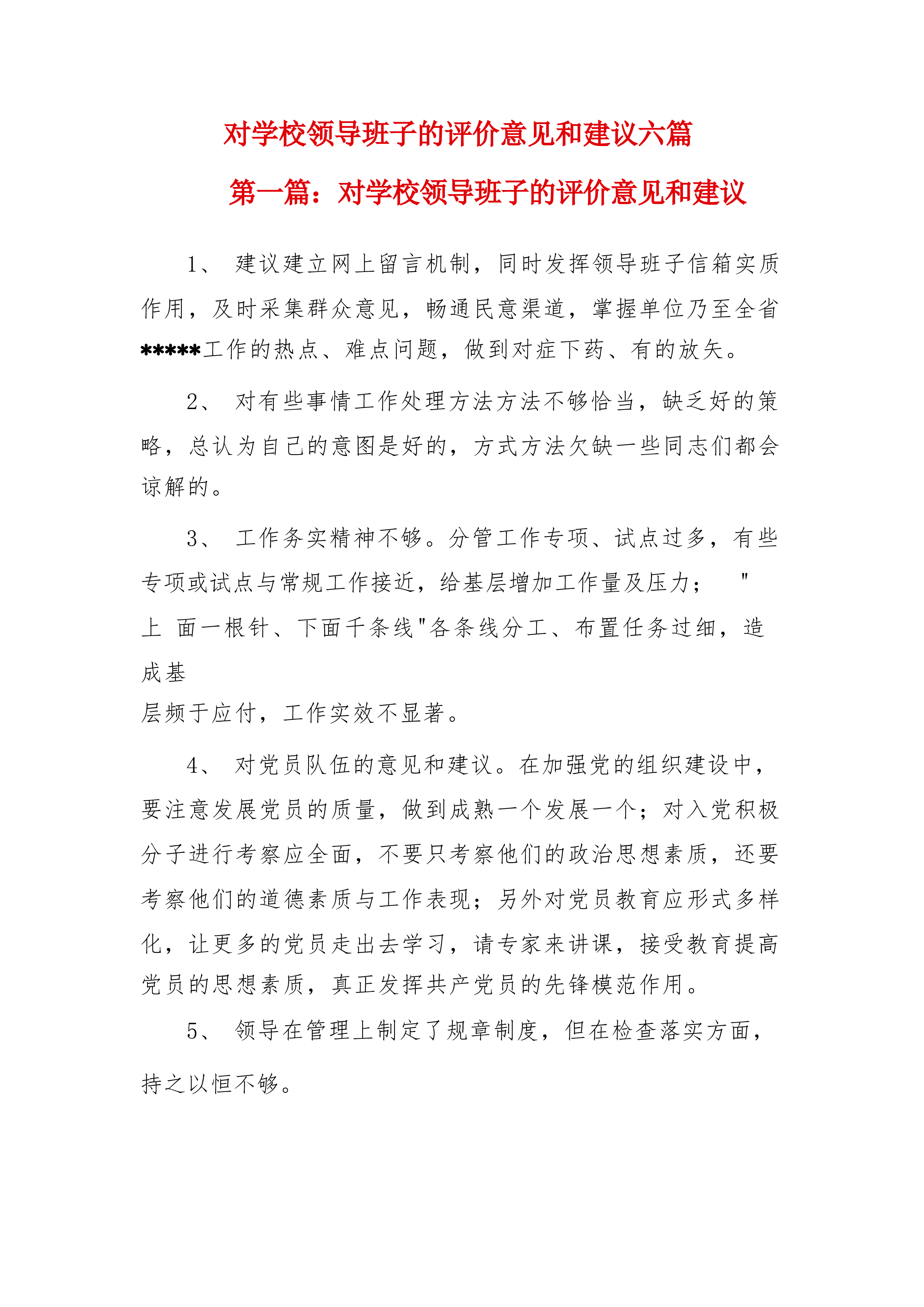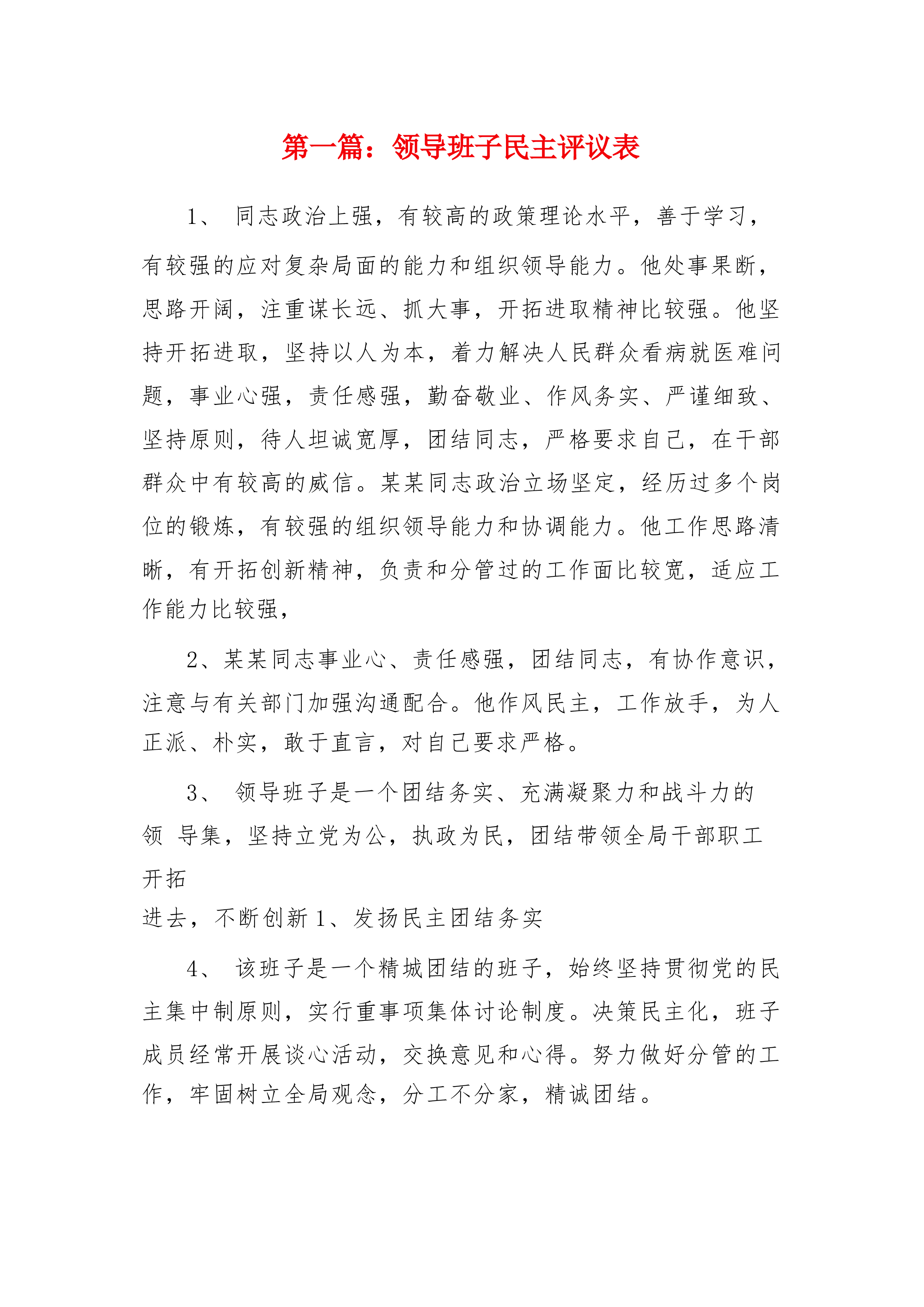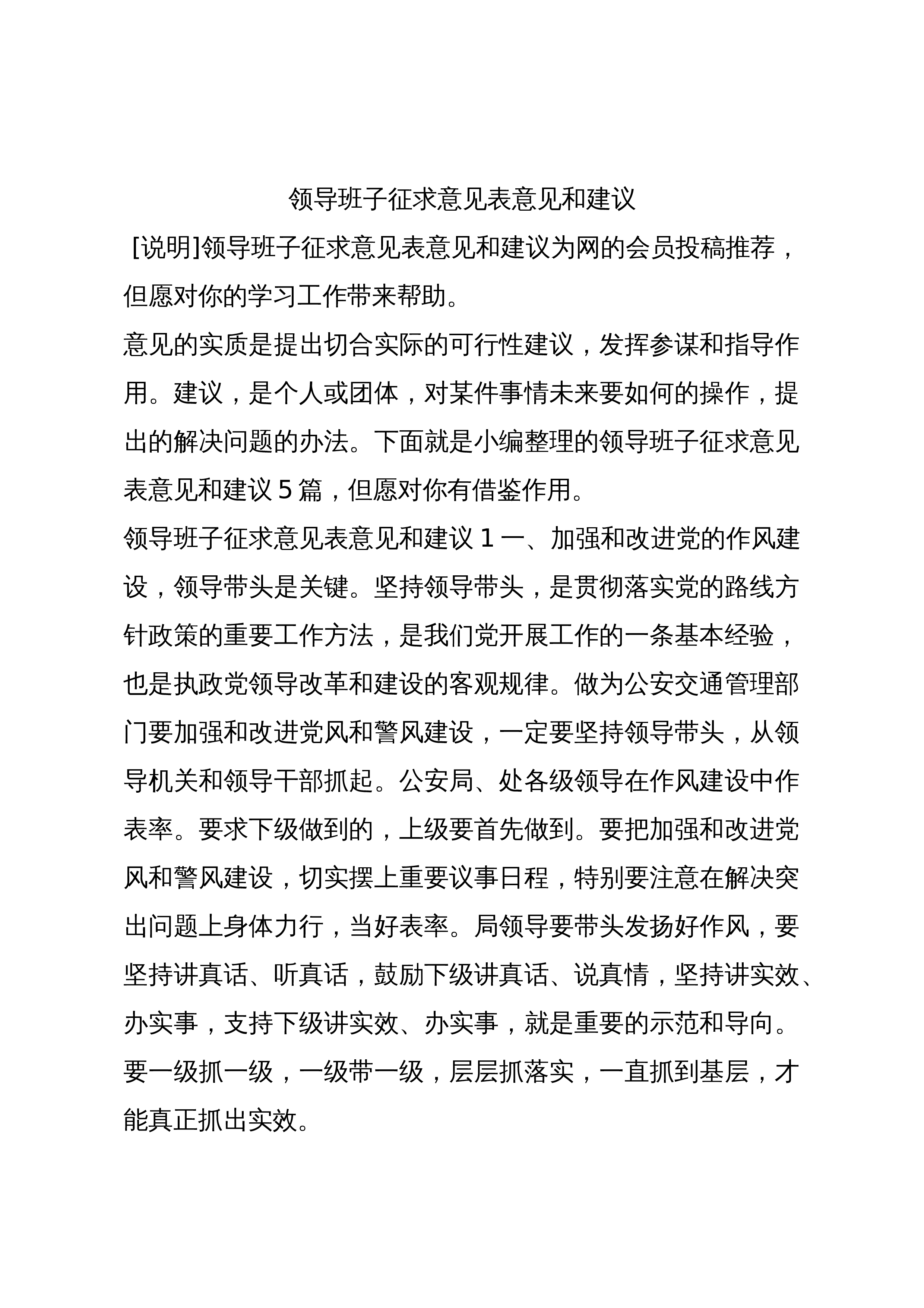 第1篇:对领导班子成员个人的意见和建议1、努力提高工作创新意识,全面提高机关工作水平,打造真正的学习型、服务型、创新型、效率型、协作型的新型政府。2、加强机关作风建设,增强社会主义责任意识,提高工作标准,彻底根除"四风"问题,提高政府部门的社会认知度。3、充分发挥机关干部的主观能动作用,设置一定的奖惩措施,激励机关干部工作积极性,形成“人人争优,各个创先”的工作风气。4、多下基层关心基层干部,了解基层干部的实际生活情况,多帮助基层解决实际困难,了解基层干部的想法,,对基层干部反映的实际问题,积极协调解决。5、在培养年轻领导干部上加大力度,挖掘年轻干部的潜力,加强对年轻干部的培训,提拔干部坚持"...
