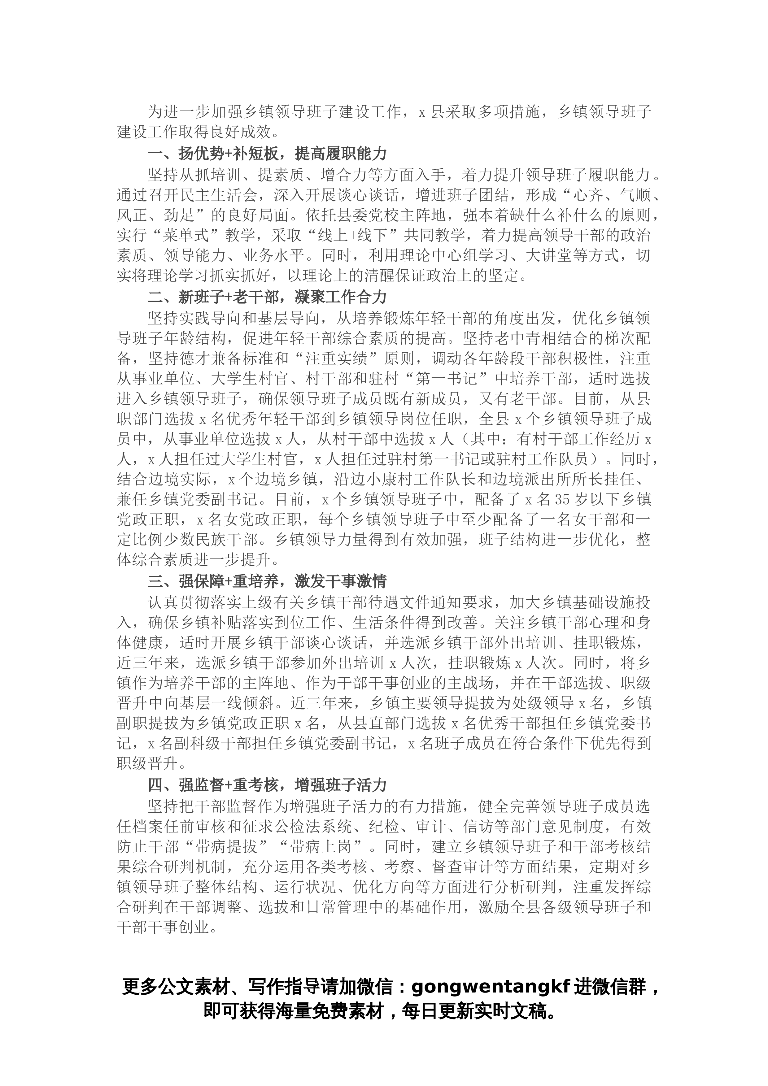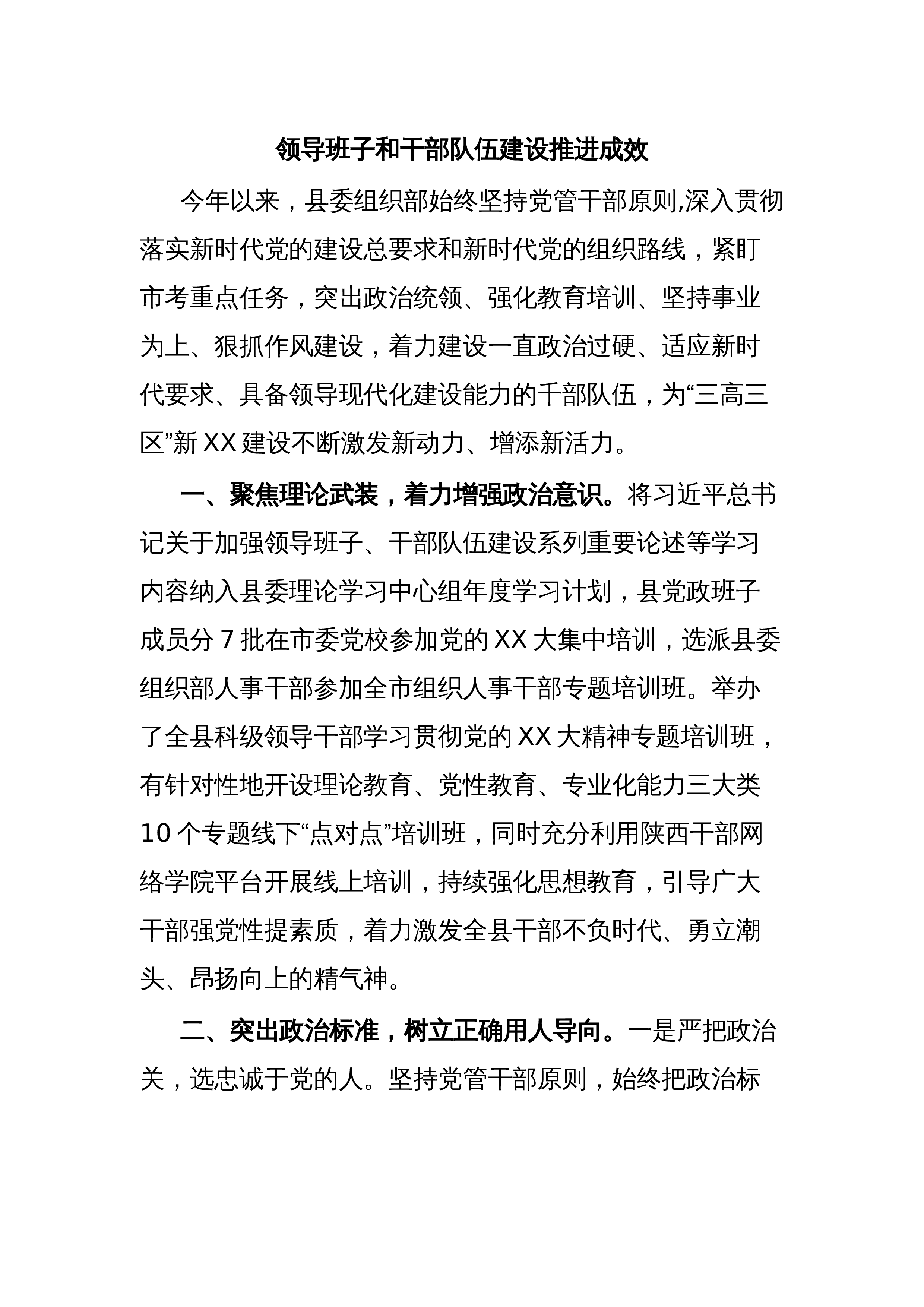 领导班子和干部队伍建设推进成效今年以来,县委组织部始终坚持党管干部原则,深入贯彻落实新时代党的建设总要求和新时代党的组织路线,紧盯市考重点任务,突出政治统领、强化教育培训、坚持事业为上、狠抓作风建设,着力建设一直政治过硬、适应新时代要求、具备领导现代化建设能力的千部队伍,为“三高三区”新XX建设不断激发新动力、增添新活力。一、聚焦理论武装,着力增强政治意识。将习近平总书记关于加强领导班子、干部队伍建设系列重要论述等学习内容纳入县委理论学习中心组年度学习计划,县党政班子成员分7批在市委党校参加党的XX大集中培训,选派县委组织部人事干部参加全市组织人事干部专题培训班。举办了全县科级领导干部学习贯彻...