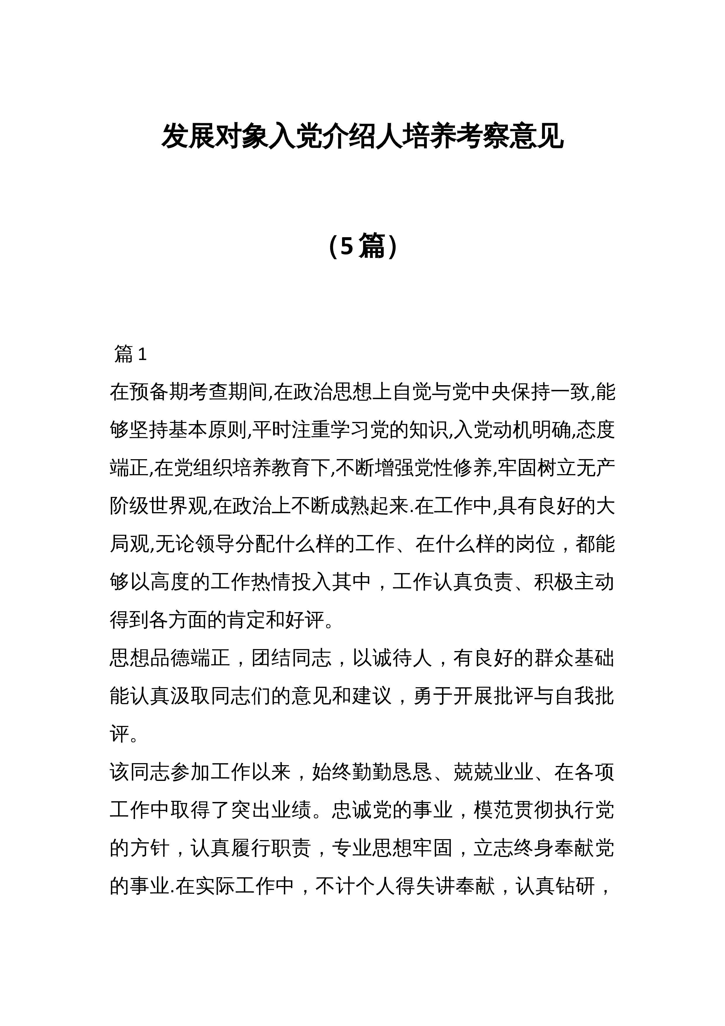 发展对象入党介绍人培养考察意见(5篇)篇1在预备期考查期间,在政治思想上自觉与党中央保持一致,能够坚持基本原则,平时注重学习党的知识,入党动机明确,态度端正,在党组织培养教育下,不断增强党性修养,牢固树立无产阶级世界观,在政治上不断成熟起来.在工作中,具有良好的大局观,无论领导分配什么样的工作、在什么样的岗位,都能够以高度的工作热情投入其中,工作认真负责、积极主动得到各方面的肯定和好评。思想品德端正,团结同志,以诚待人,有良好的群众基础能认真汲取同志们的意见和建议,勇于开展批评与自我批评。该同志参加工作以来,始终勤勤恳恳、兢兢业业、在各项工作中取得了突出业绩。忠诚党的事业,模范贯彻执行党的方针...