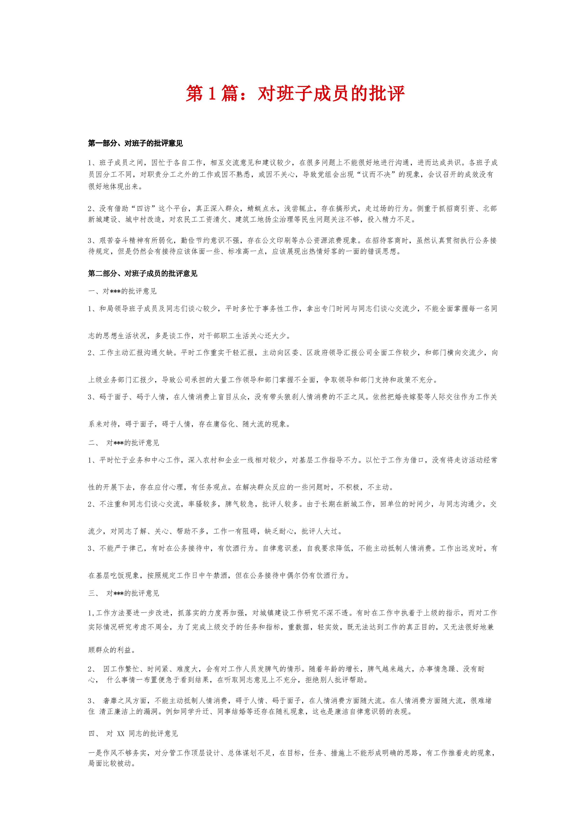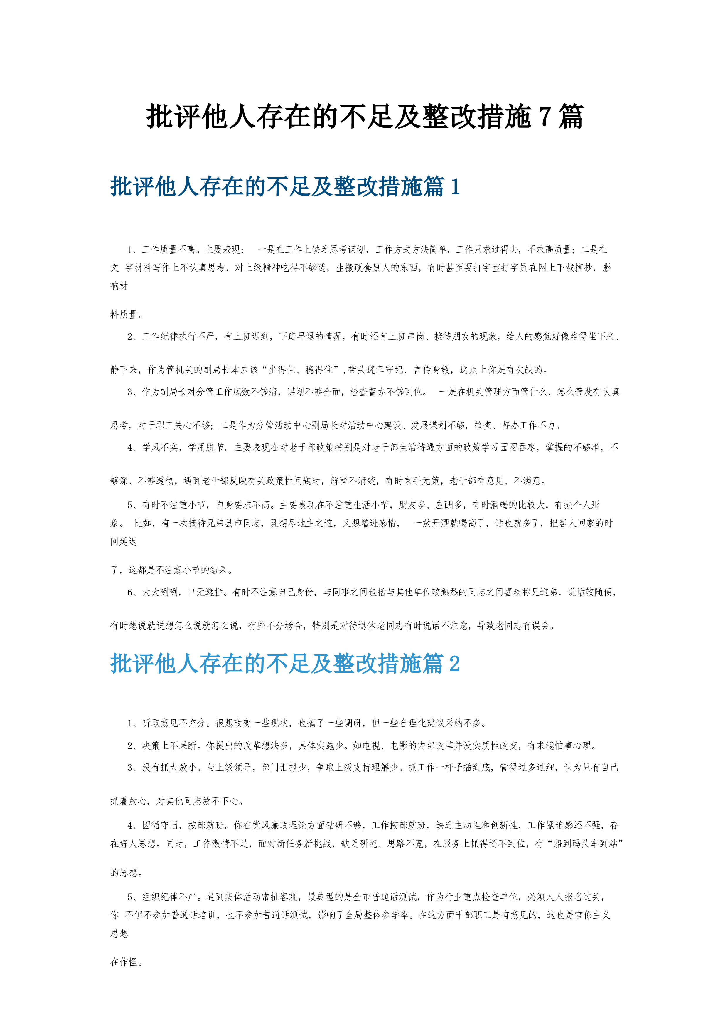 批评他人存在的不足及整改措施7篇批评他人存在的不足及整改措施篇11、工作质量不高。主要表现:一是在工作上缺乏思考谋划,工作方式方法简单,工作只求过得去,不求高质量;二是在文字材料写作上不认真思考,对上级精神吃得不够透,生搬硬套别人的东西,有时甚至要打字室打字员在网上下载摘抄,影响材料质量。2、工作纪律执行不严,有上班迟到,下班早退的情况,有时还有上班串岗、接待朋友的现象,给人的感觉好像难得坐下来、静下来,作为管机关的副局长本应该“坐得住、稳得住”,带头遵章守纪、言传身教,这点上你是有欠缺的。3、作为副局长对分管工作底数不够清,谋划不够全面,检查督办不够到位。一是在机关管理方面管什么、怎么管没有...
