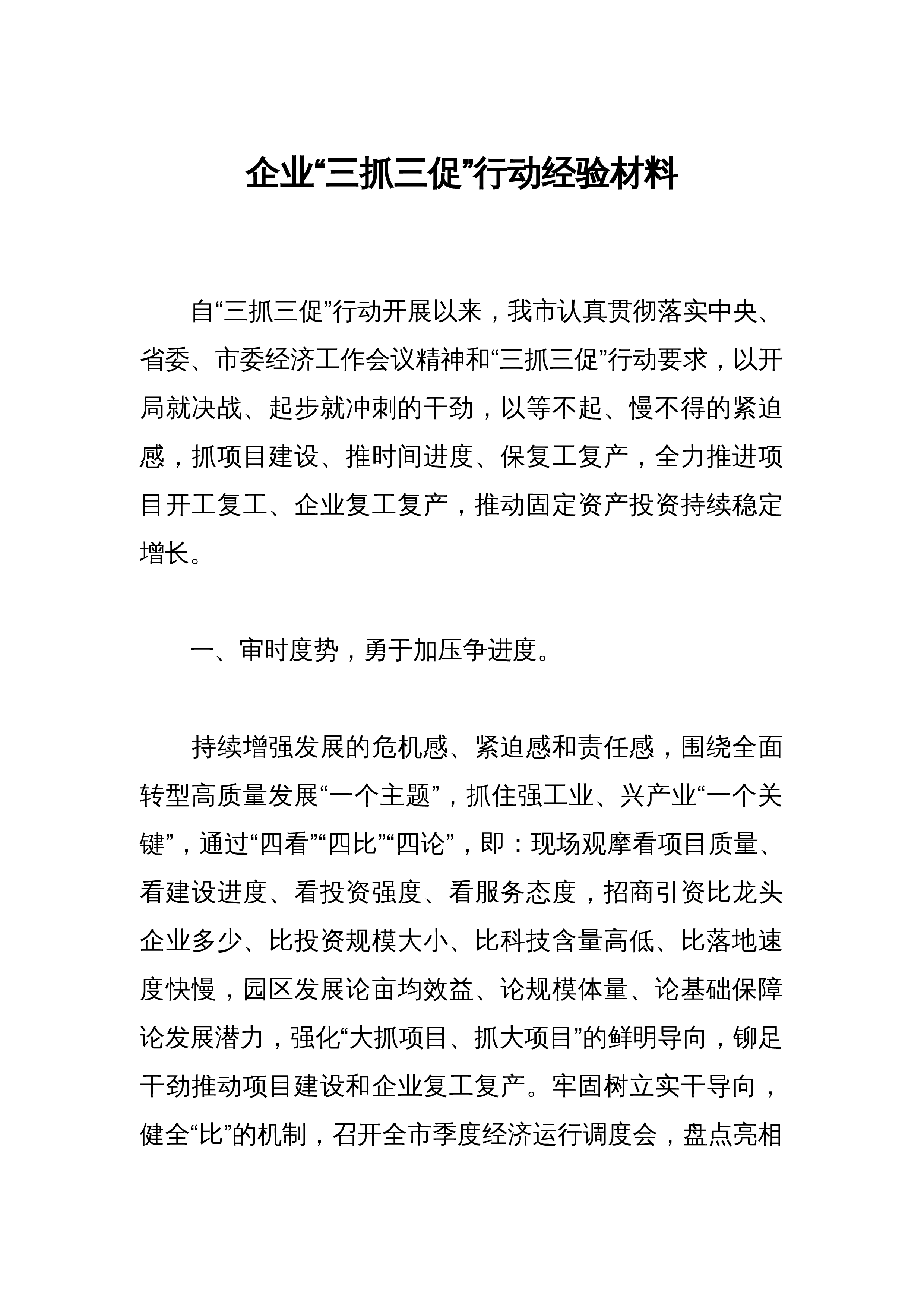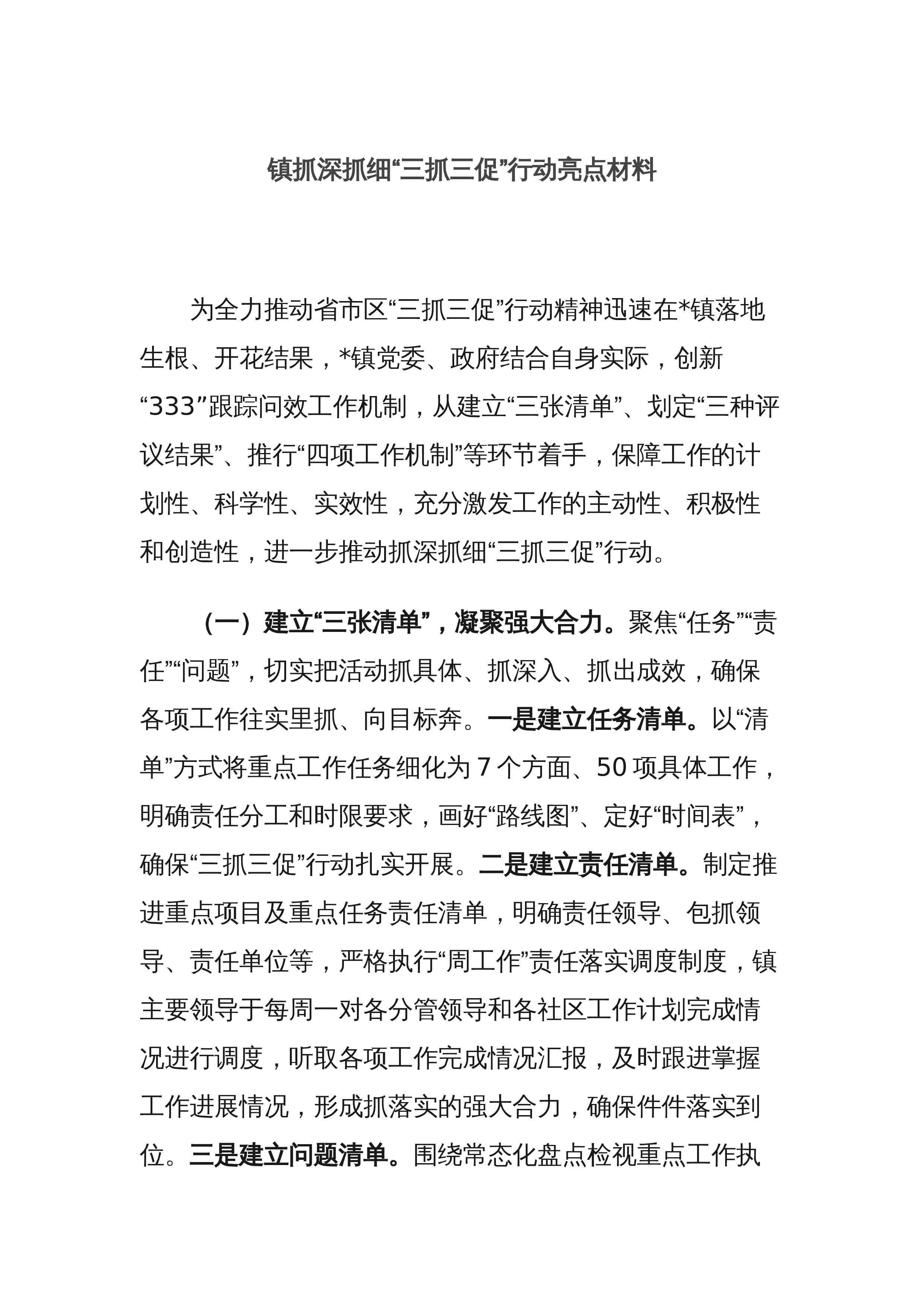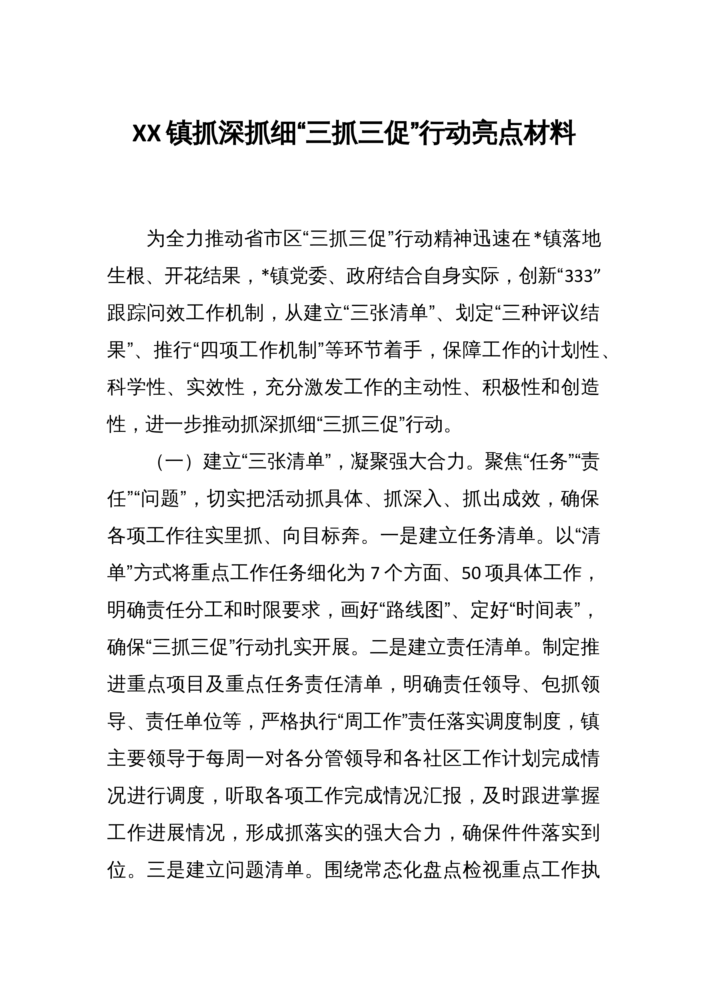 镇抓深抓细“三抓三促”行动亮点材料 为全力推动省市区“三抓三促”行动精神迅速在*镇落地生根、开花结果,*镇党委、政府结合自身实际,创新“333”跟踪问效工作机制,从建立“三张清单”、划定“三种评议结果”、推行“四项工作机制”等环节着手,保障工作的计划性、科学性、实效性,充分激发工作的主动性、积极性和创造性,进一步推动抓深抓细“三抓三促”行动。(一)建立“三张清单”,凝聚强大合力。聚焦“任务”“责任”“问题”,切实把活动抓具体、抓深入、抓出成效,确保各项工作往实里抓、向目标奔。一是建立任务清单。以“清单”方式将重点工作任务细化为7个方面、50项具体工作,明确责任分工和时限要求,画好“路线图”、...