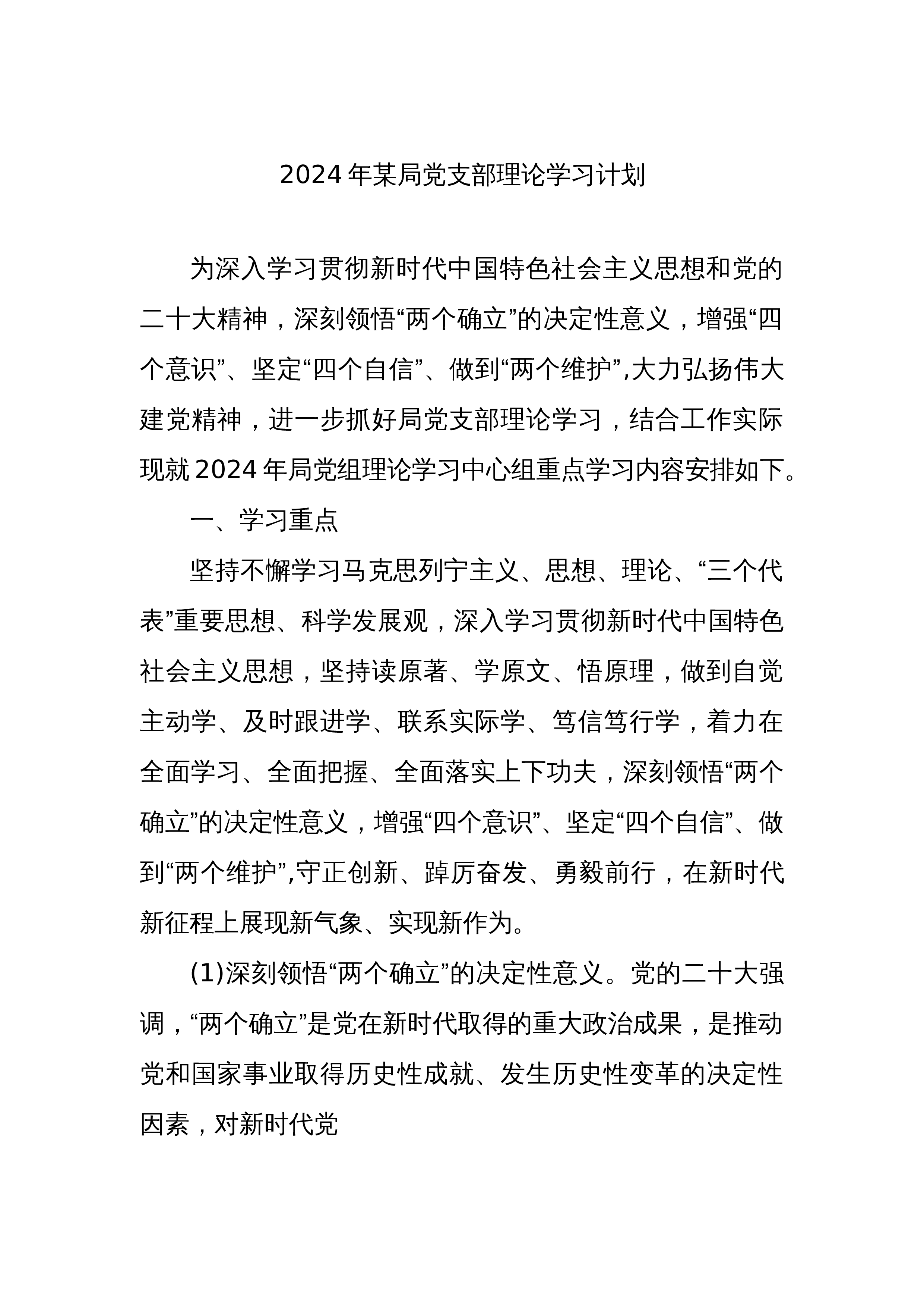 2024年某局党支部理论学习计划为深入学习贯彻新时代中国特色社会主义思想和党的二十大精神,深刻领悟“两个确立”的决定性意义,增强“四个意识”、坚定“四个自信”、做到“两个维护”,大力弘扬伟大建党精神,进一步抓好局党支部理论学习,结合工作实际现就2024年局党组理论学习中心组重点学习内容安排如下。一、学习重点坚持不懈学习马克思列宁主义、思想、理论、“三个代表”重要思想、科学发展观,深入学习贯彻新时代中国特色社会主义思想,坚持读原著、学原文、悟原理,做到自觉主动学、及时跟进学、联系实际学、笃信笃行学,着力在全面学习、全面把握、全面落实上下功夫,深刻领悟“两个确立”的决定性意义,增强“四个意识”、坚...