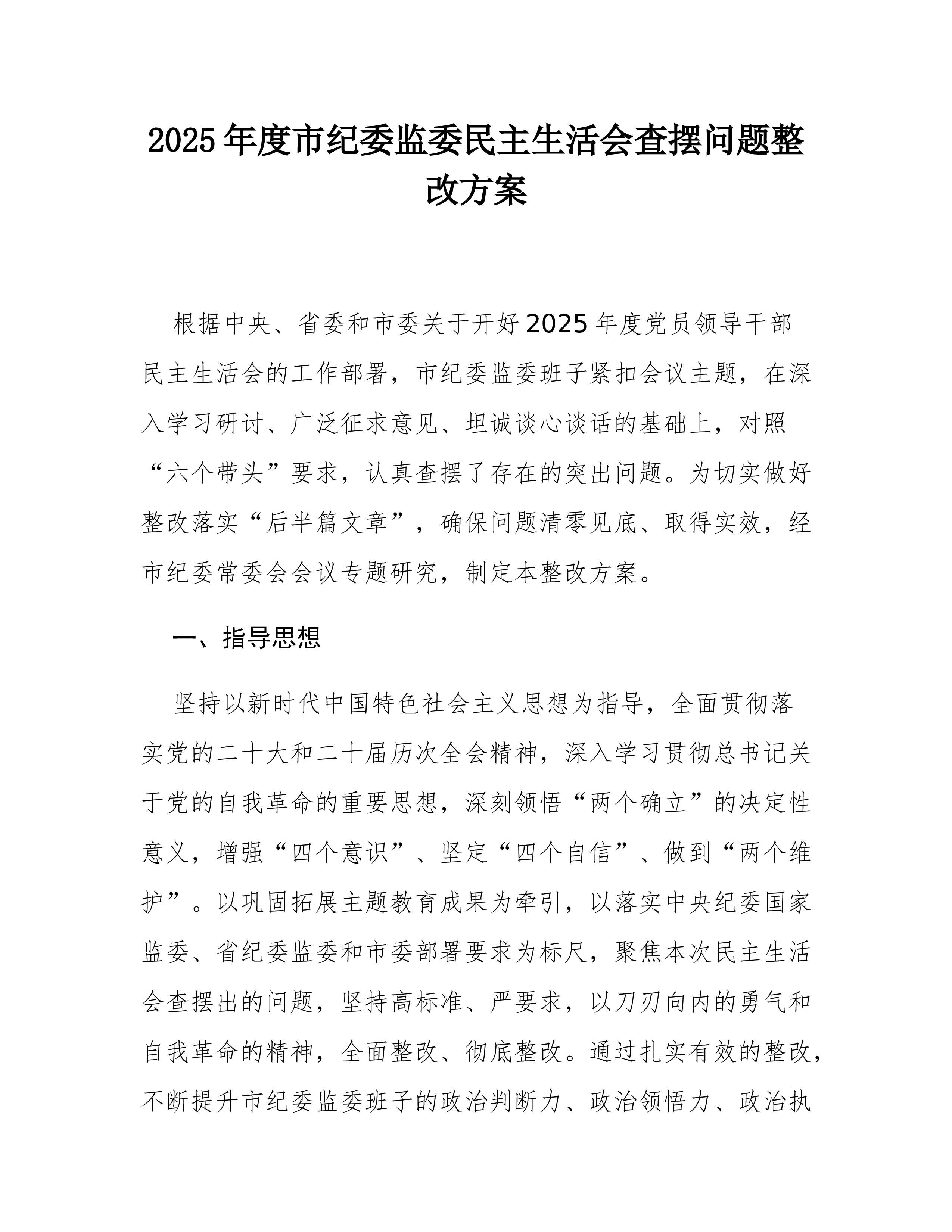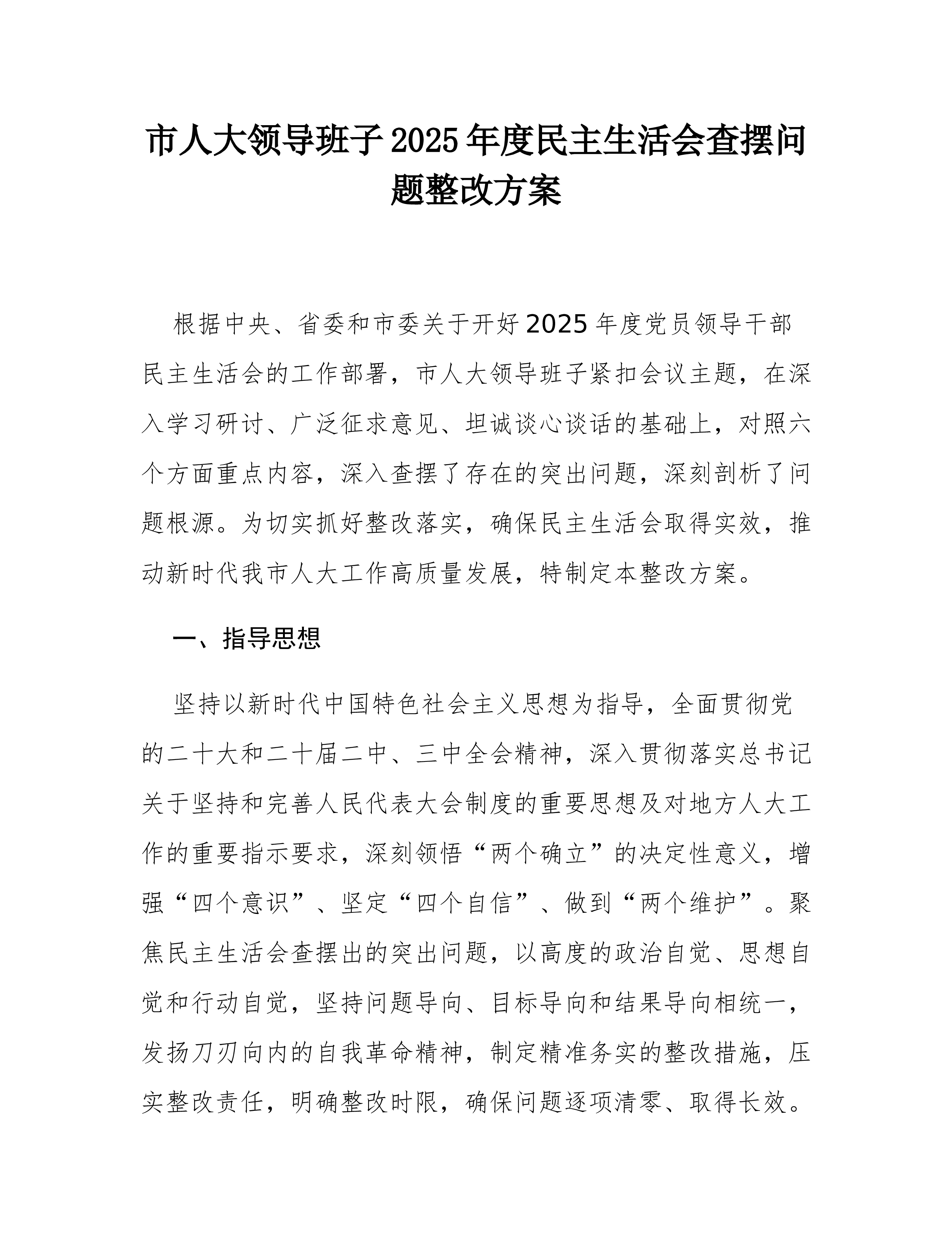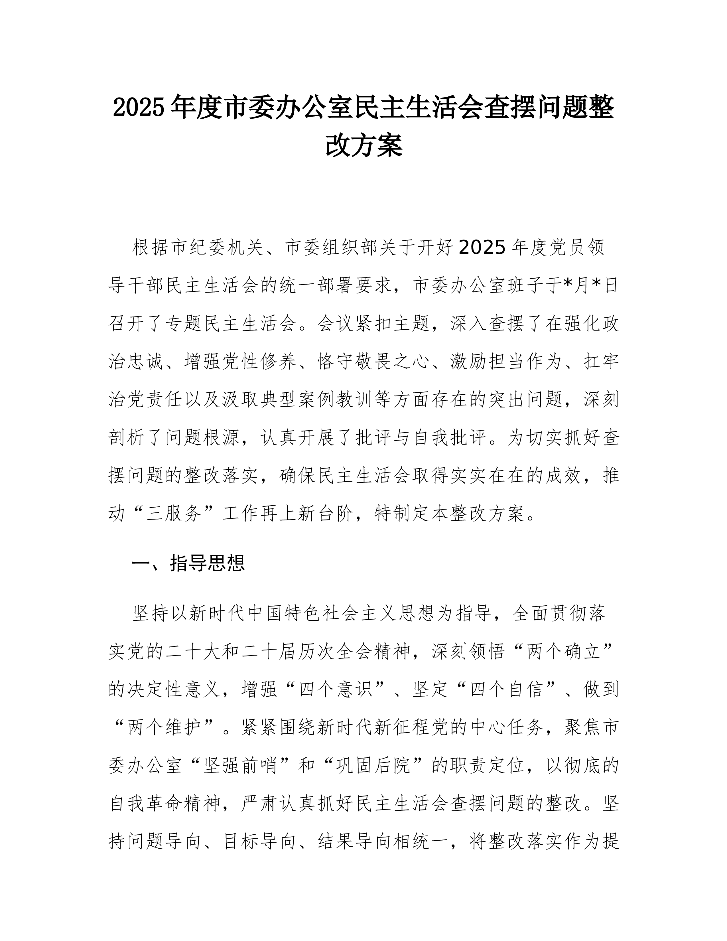 2025年度市委办公室民主生活会查摆问题整改方案根据市纪委机关、市委组织部关于开好2025年度党员领导干部民主生活会的统一部署要求,市委办公室班子于*月*日召开了专题民主生活会。会议紧扣主题,深入查摆了在强化政治忠诚、增强党性修养、恪守敬畏之心、激励担当作为、扛牢治党责任以及汲取典型案例教训等方面存在的突出问题,深刻剖析了问题根源,认真开展了批评与自我批评。为切实抓好查摆问题的整改落实,确保民主生活会取得实实在在的成效,推动“三服务”工作再上新台阶,特制定本整改方案。一、指导思想坚持以新时代中国特色社会主义思想为指导,全面贯彻落实党的二十大和二十届历次全会精神,深刻领悟“两个确立”的决定性意义,增强“四个意识”、坚定“四个自信”、做到“两个维护”。紧紧围绕新时代新征程党的中心任务,聚焦市委办...