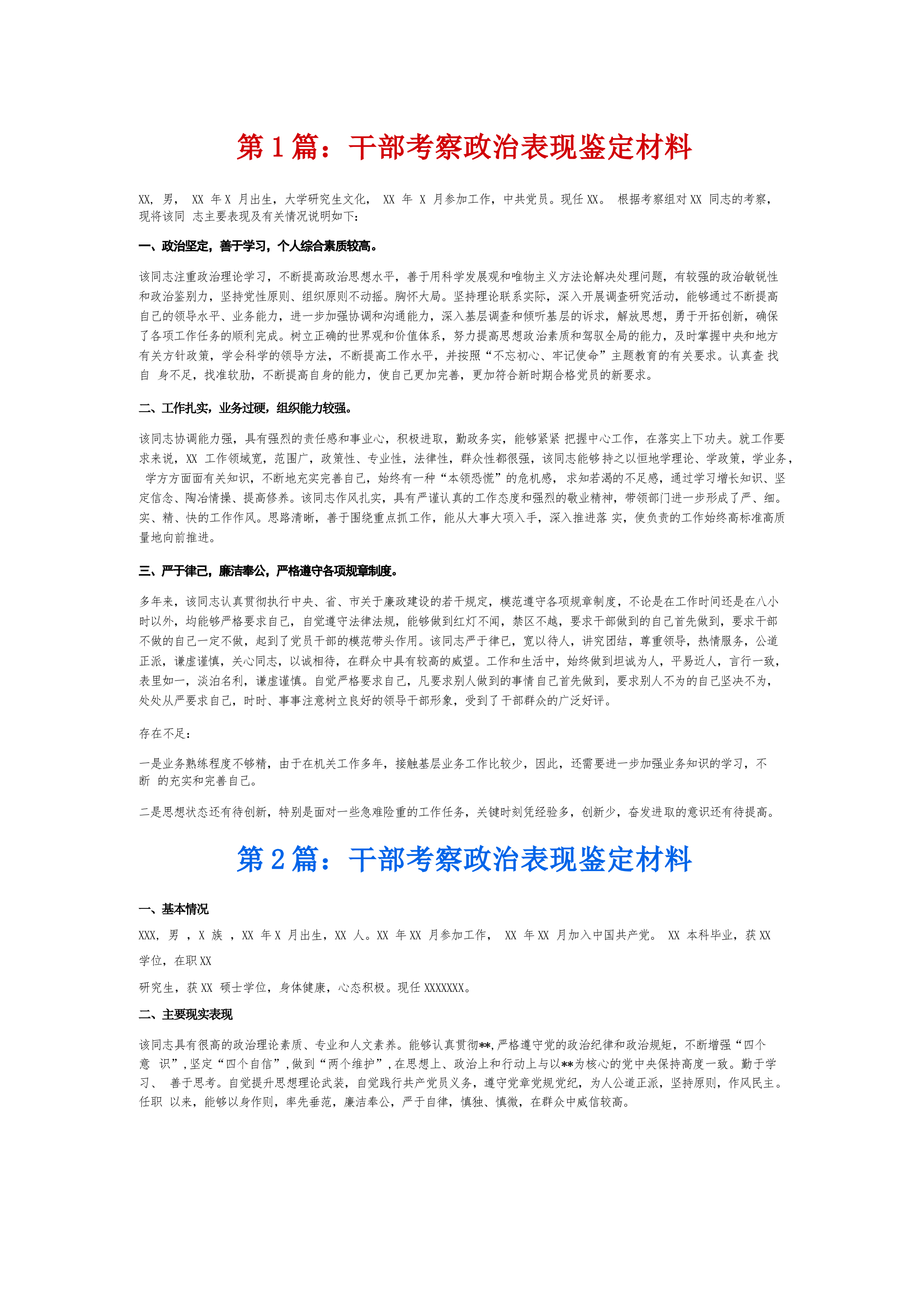第1篇:干部考察政治表现鉴定材料XX,男,XX年X月出生,大学研究生文化,XX年X月参加工作,中共党员。现任XX。根据考察组对XX同志的考察,现将该同志主要表现及有关情况说明如下:一、政治坚定,善于学习,个人综合素质较高。该同志注重政治理论学习,不断提高政治思想水平,善于用科学发展观和唯物主义方法论解决处理问题,有较强的政治敏锐性和政治鉴别力,坚持党性原则、组织原则不动摇。胸怀大局。坚持理论联系实际,深入开展调查研究活动,能够通过不断提高自己的领导水平、业务能力,进一步加强协调和沟通能力,深入基层调查和倾听基层的诉求,解放思想,勇于开拓创新,确保了各项工作任务的顺利完成。树立正确的世界观和价值...